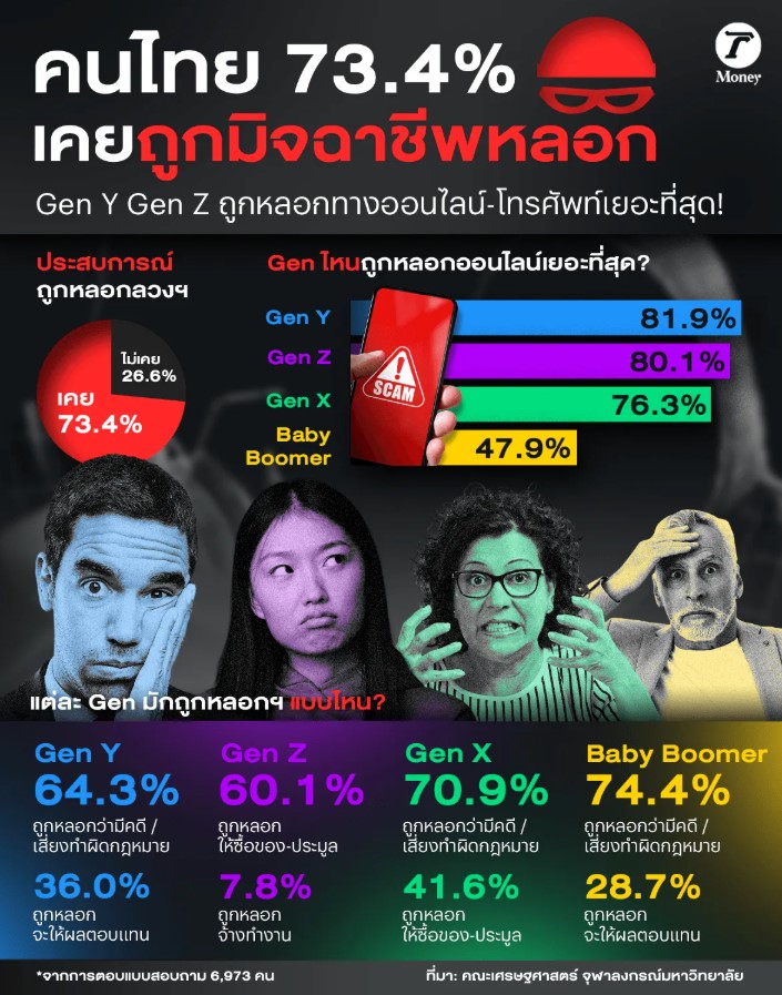 คนไทย 73.4% เคยถูกมิจฉาชีพหลอก Gen Y Gen Z ถูกหลอก ทางออนไลน์-โทรศัพท์เยอะที่สุด! .