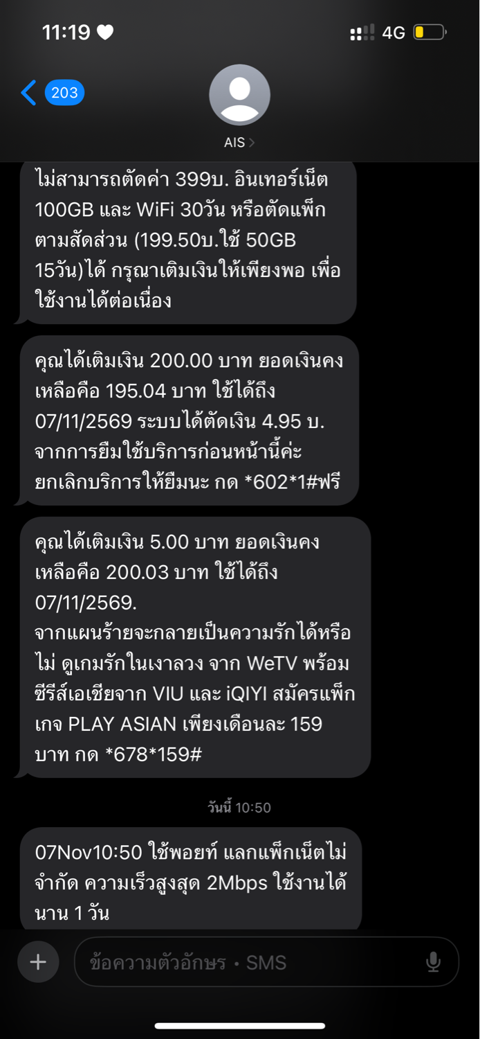 พอดีลืมเติมเงินทิ้งไว้ เลยตัดแพ็กไม่ไดั แต่พอเห็นก็เติมทันที ทีนี้มันไม่ตัดค่าแพ็กเกจให้ค่ะ แล้วก็กินตังค์ค่าเน็ตที่เติมไปเพิ่ม8฿ด้วยเพราะต้องเปิดเน็ตไปใช้ในแอพเพื่อเอาพอยแลกเน็ตมาใช้ชั่วคราวก่อน จะติดต่อหาAISโดยตรงก็ยากฝากเรื่องส่งอีเมลก็ส่งไปตั้งแต่เมื่อคืนแล้วนึกว่าจะจัดการไว ตอนนี้ไม่มีวี่แววเลยค่ะ ต้องทำยังไง