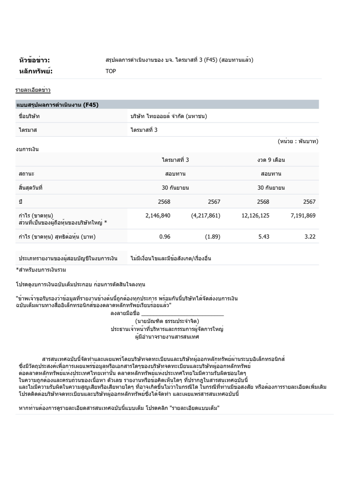 ยกเลิกขายน้ำมันให้เขมรไม่กระทบเท่าไร Q3/68 OR กำไรพุ่ง +17% QoQ และ งวด 9เดือนกำไรพุ่ง +98.36%