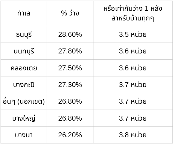 พื้นที่ธนบุรีมีอัตราว่างของห้องชุดสูงสุดถึง 28.6% หรือว่าง 1 หน่วยในทุกๆ 3.5 หน่วยของห้องชุด หรือทั้งหมดข้างต้นนี้มีอัตราว่างสูงถึง 1 หลังในทุกๆ ไม่เกิน 4 หลัง ซึ่งถือว่าจะกลายเป็นอุปทานมาขายแข่งกับผู้ประกอบการเป็นอย่างมาก