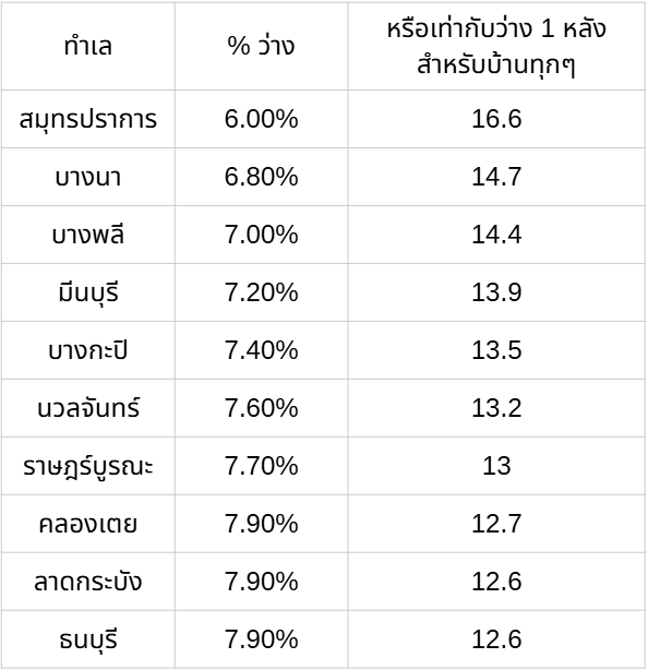ทั้งนี้พื้นที่ๆ ปลอดภัยที่สุดได้แก่ สมุทรปราการโดยบ้านแนวราบโดยรวมมีอัตราว่างเพียง 6.0% หรือว่าง 1 หน่วย ในทั้งหมด 16.6 หน่วย รองลงมาได้แก่พื้นที่ สมุทรปราการ บางนา บางพลี มีนบุรี บางกะปิ นวลจันทร์ ราษฎร์บูรณะ คลองเตย ลาดกระบัง และธนบุรี โดยมีอัตราว่างเพียง 6% - 7.9% เท่านั้น แสดงว่าพื้นที่เหล่านี้ยังเหมาะสมที่จะพัฒนาที่อยู่อาศัยแนวราบได้อีกตามสมควร