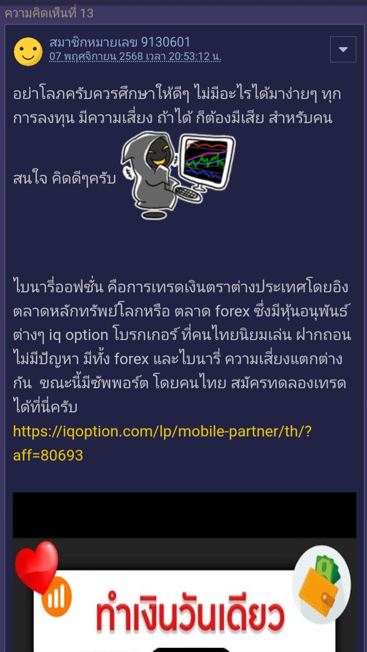 หมายเลขกระทู้ 9130601 ได้เข้ามาโพสโฆษณาชวนเชื่อเกี่ยวกับการเทรดในกระทู้เราค่ะ เนื้อหาเกี่ยวกับการเทรด IQ Option โดยมีเนื้อหาโฆษณาทำนองเตือนให้ระวังการเทรดนำมาก่อนและตามด้วยคลิปยูทูปอวดอ้างเกี่ยวกับการเทรดแล้วได้เงินไวรวยไวประมาณ 4-5 คลิป