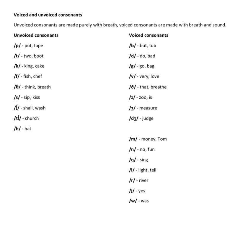 [Spoil] คลิกเพื่อดูข้อความที่ซ่อนไว้แต่ถ้าจะเอา list ให้ท่องก็คือพยัญชนะแบบ voiced consonants ได้แก่ b / d / g / j / l / m / n / r / v / w / y / z รวมถึง th- ในคำว่า this และ -s- ในคำว่า asia ส่วนพยัญชนะแบบ unvoiced หรือ voiceless ก็คือ c / f / h / k / p / q / s / t / x และรวมถึง th- ในคำว่า think และ ch- ในคำว่า church และ sh- ในคำว่า shop ครับ หรือดูจากตารางที่ผมแยกไว้ตามรูปนี้ได้เลย