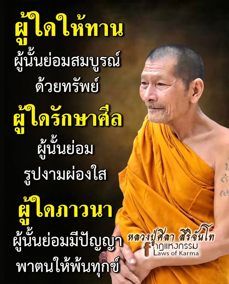 ผู้ใดให้ทานผู้นั้นย่อมสมบูรณ์ด้วยทรัพย์ ผู้ใดรักษาศิลย่อมผ่องใส ผู้ใดภาวนาย่อมมีปัญญาพาตัวเองให้พ้นทุกข์