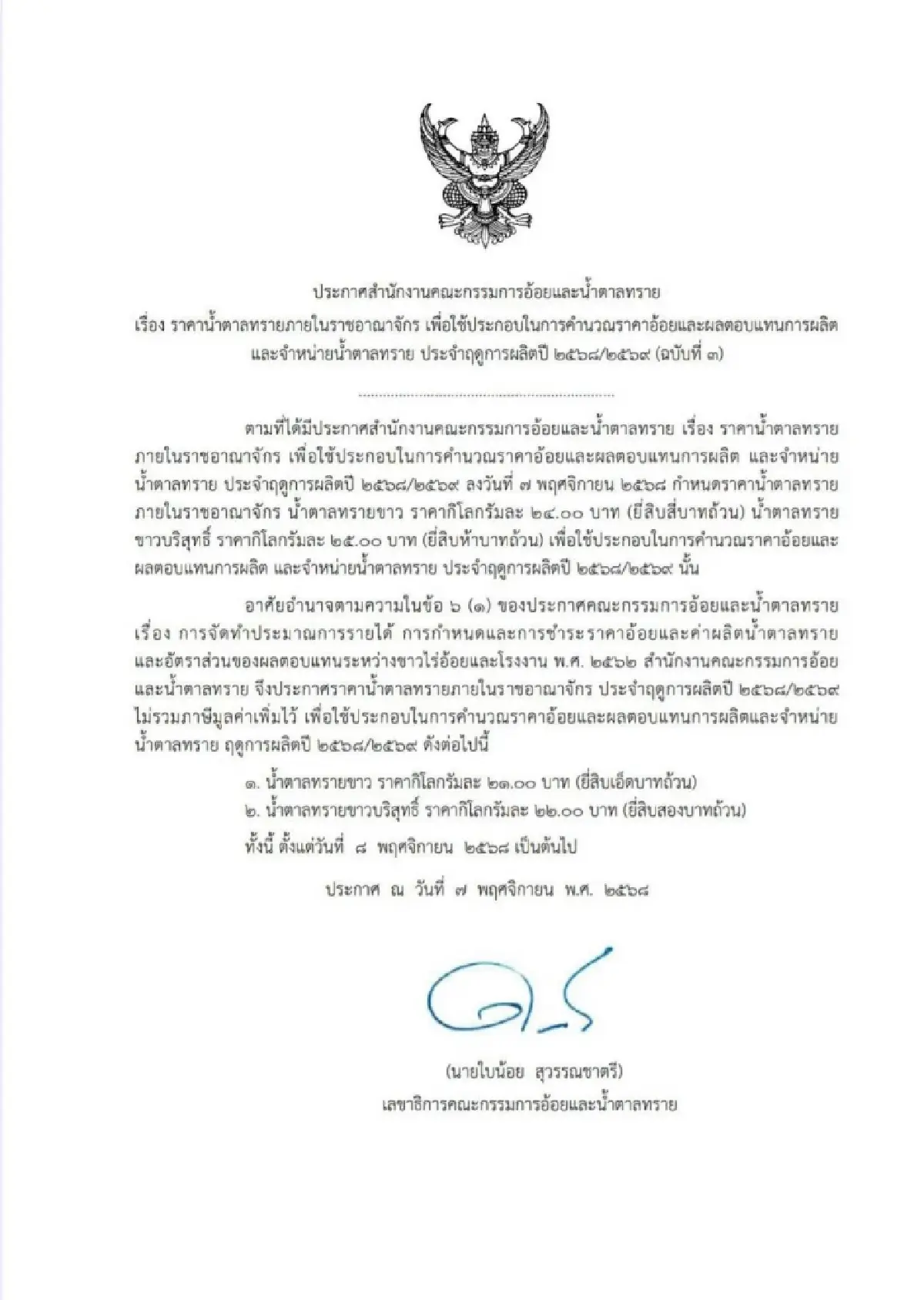 อย่างไรก็ตาม ภายหลังจากประเมินต้นทุนการผลิตอ้อยและน้ำตาลที่ปรับตัวสูงขึ้น สอน. ได้ออกประกาศฉบับที่ 2 (ลงวันที่ 7 พฤศจิกายน 2568) ปรับราคาน้ำตาลทรายใหม่เป็น