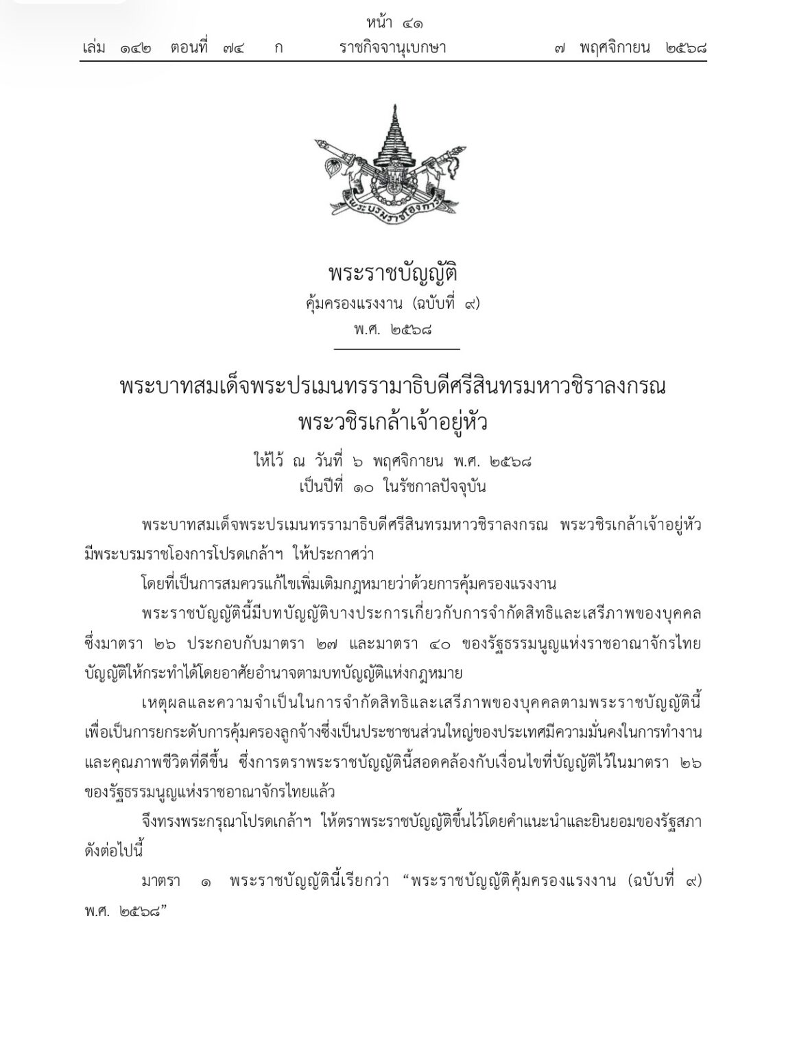 ราชกิจจานุเบกษาได้ประกาศพระราชบัญญัติคุ้มครองแรงงาน (ฉบับที่ 9) พ.ศ. 2568 เมื่อวันที่ 7 พฤศจิกายน 2568 โดยเป็นการแก้ไขเพิ่มเติมกฎหมายคุ้มครองแรงงาน พ.ศ. 2541 ในประเด็นสิทธิการลาหยุดและการคุ้มครองสถานภาพการจ้างของลูกจ้าง