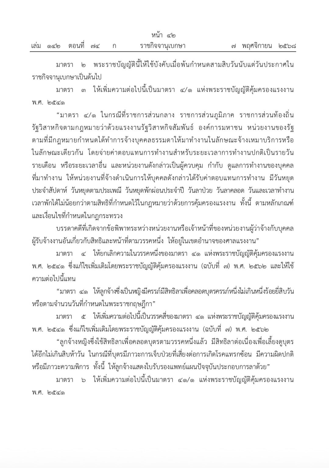 กล่าวคือ หญิงมีครรภ์สามารถลาคลอดได้ไม่เกิน 120 วัน จากเดิม 98 วัน คู่สมรสมีสิทธิลาช่วยดูแลหลังคลอดได้ไม่เกิน 15 วัน โดยกฎหมายใหม่จะมีผลเมื่อพ้น 30 วันนับแต่ประกาศในราชกิจจานุเบกษา หรือวันที่ 7 ธันวาคม 2568