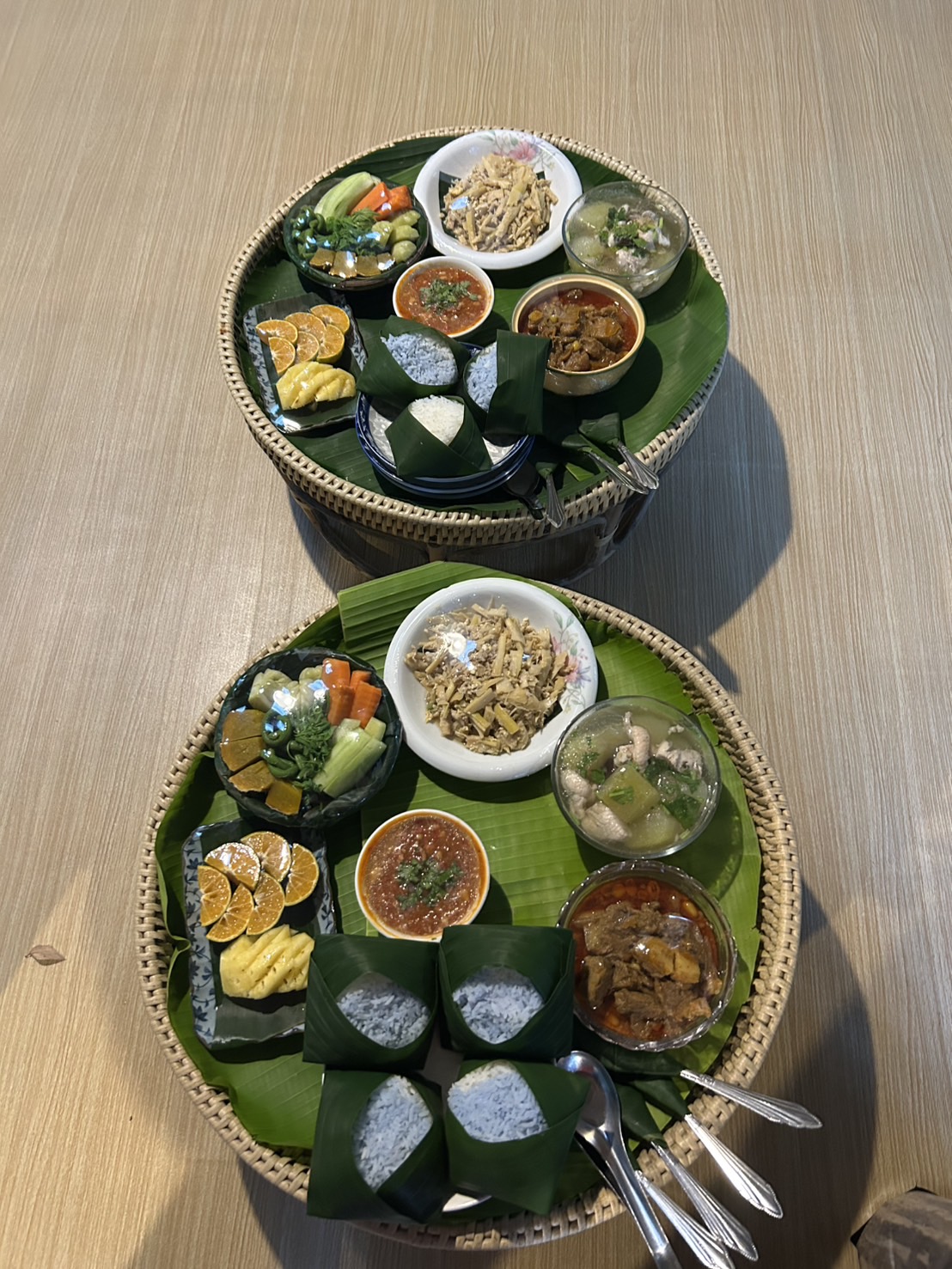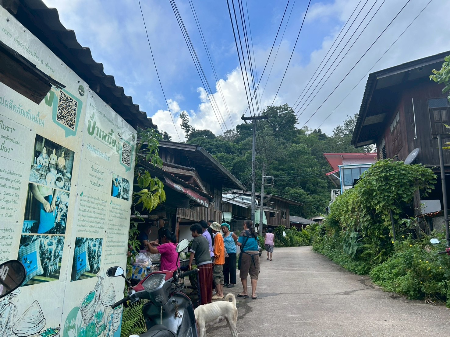 เรานั่งอยู่ที่ร้านนี้กันยาวจนถึงประมาณ 07:20 น. เป็นเช้าที่เงียบสงบและมีความสุขที่สุดในรอบหลายเดือน หลังจากนั้นเราก็เดินลงมาช้า ๆ จากบนเนิน ระหว่างทางเจอชาวบ้านตื่นทำกับข้าว ขายผักหน้าบ้านและมีการขายใบเหมี้ยง ทุกคนยิ้มทักทายแบบอบอุ่น เราได้พูดคุยกับคุณตา คุณยาย และคุณน้าหลายคน ทุกคนเป็นมิตรจนรู้สึกเหมือนมาเยี่ยมญาติในต่างจังหวัด ก่อนกลับเราจึงแวะไหว้พระที่ “วัดป่าเหมี้ยง” เป็นวัดเล็ก ๆ กลางหมู่บ้าน เงียบสงบ มีต้นไม้ใหญ่ล้อมรอบ มีเสียงระฆังตอนเช้าเบา ๆ เข้ากับบรรยากาศแบบนี้จริง ๆ กลับมาถึงที่พัก คุณพี่เจ้าของที่พักก็เตรียมอาหารเช้าไว้ให้พร้อม เช้านี้มี ข้าวต้มร้อน ๆ ผัดผัก และผลไม้ตามฤดูกาลเรียบง่ายแต่เติมพลังสุด ๆ กินเสร็จก็อาบน้ำ พักผ่อนจนถึงประมาณ 10 โมงเช้า เพื่อที่จะเตรียมตัวไปเยี่ยม