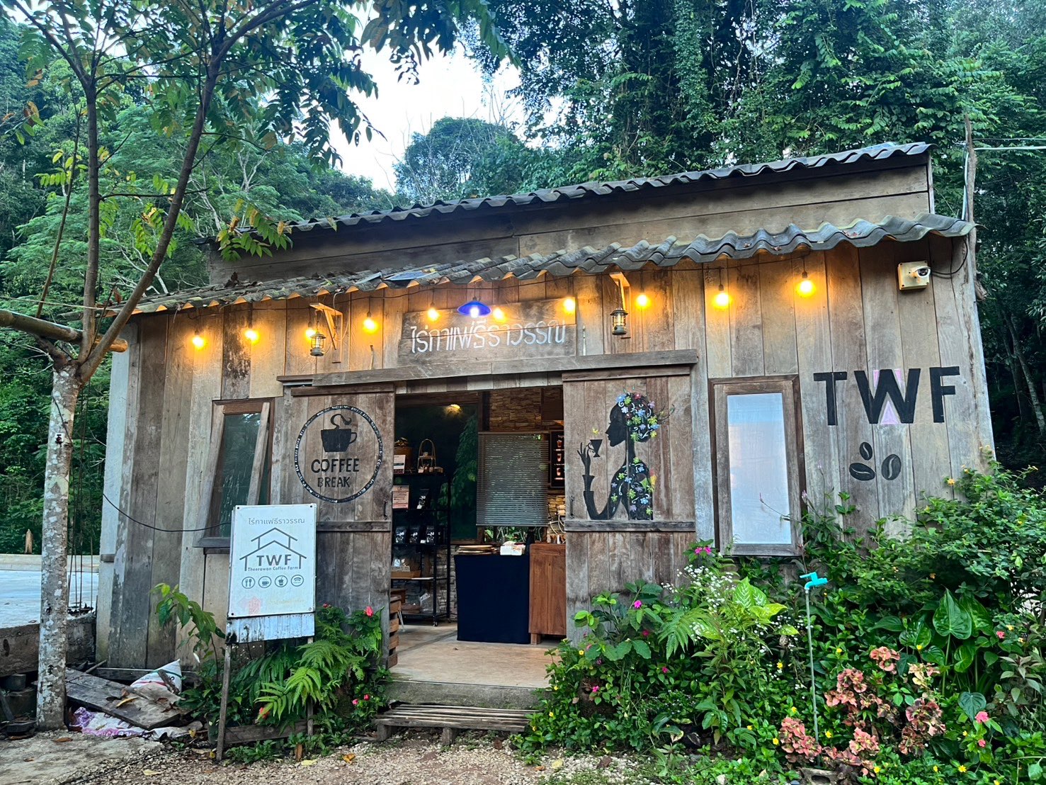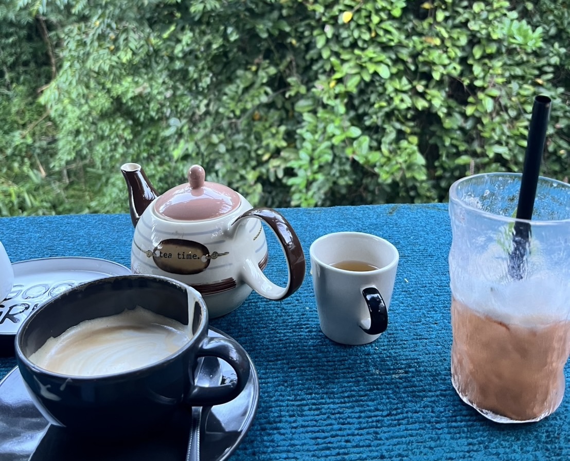 พวกเราตื่นขึ้นมาตอนประมาณ 05:40 น. อากาศเย็นมาก วันนี้พวกเรามีแพลนจะไปดูพระอาทิตย์ขึ้น เลยรีบล้างหน้าแปรงฟันกัน แล้วออกเดินจากที่พักขึ้นไปบนเนินในหมู่บ้าน หวังจะหาจุดที่เห็นพระอาทิตย์ชัด ๆ แต่ระหว่างทาง…เรากลับเจอสิ่งที่น่าสนใจเช่นเดียวกับตามหาแสงอาทิตย์ยามเช้า คือ “ร้านกาแฟไร่ธีราวรรณ” ร้านเล็ก ๆ ซ่อนอยู่ท่ามกลางหมอกและต้นไม้ พวกเรารีบเข้าไปหาอะไรร้อนๆ ทานเพื่อคลายความหนาว ในร้านมีหลายเมนูแนะนำ พวกเราเลือกที่จะสั่งคนละเมนู เพื่อที่จะได้สลับกันลองชิม ทั้ง ชาไทย โกโก้ ชาใบเหมี้ยงที่พี่ๆแนะนำ และลาเต้ร้อน เพื่อนอีกคนสายกาแฟตัวจริง ได้ลอง “ดริปกาแฟเอง” ด้วย รสชาติของแต่ละแก้วคือดีมากกก โดยเฉพาะชาไทย เข้ม หอม มัน กลมกล่อมสุด ๆ พูดเลยว่า “ใครมาป่าเหมี้ยง ต้องมาลองชาไทยร้านนี้!”