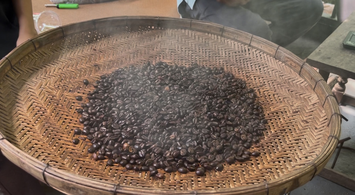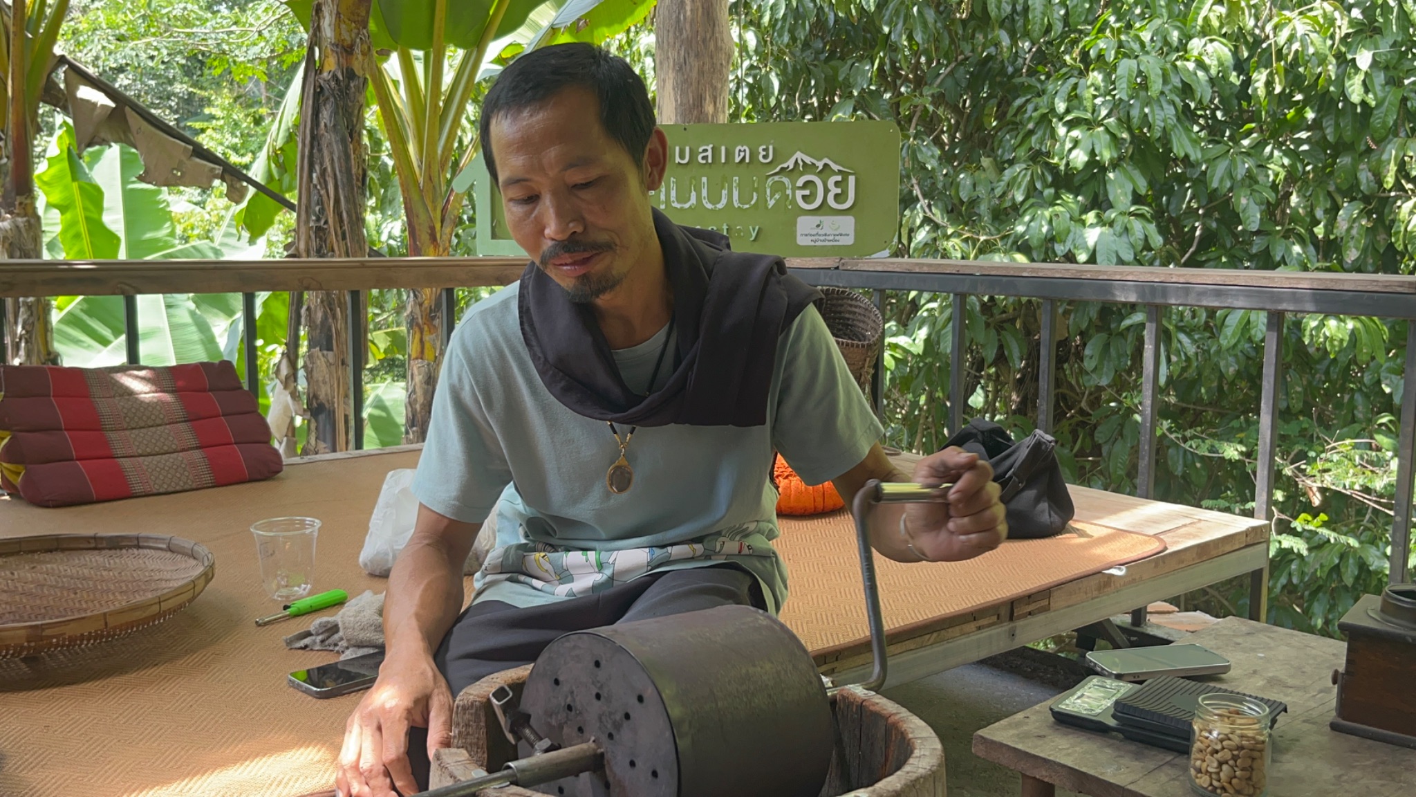 “บ้านพี่หนุ่ม” เจ้าของร้านกาแฟและโฮมสเตย์ “คนบนดอย” ในหมู่บ้าน พี่หนุ่มพาเราเดินชมสวน ในสวนมีทั้งต้นใบเหมี้ยง , ต้นกาแฟอาราบิก้า และต้นอื่น ๆ ได้พี่หนุ่มได้ลองปลูก พร้อมทั้งอธิบายเรื่องใบเหมี้ยงแบบละเอียด ตั้งแต่ขั้นตอนการปลูก การเก็บเกี่ยว ว่า “ใบไหนถึงจะเด็ดได้ ใบไหนยังอ่อนเกินไป” หรือ “การเก็บลักษณะใบแบบไหนนำไปทำเป็นชาเขียว ชาขาวและชาดำ” ซึ่งทำให้รู้ได้เลยว่ากว่าจะได้ชาสักถ้วย ไม่ใช่เรื่องง่ายเลย นอกจากนี้ยังมีต้นหนำเลี้ยบที่พวกเราตามหา ชาวบ้านจะเรียกต้นนี้ว่า “หมักใบ” พี่หนุ่มบอกว่า “ปีหนึ่งจะออกผลแค่ครั้งเดียว” ตอนเราไปยังไม่ออกผลเลยอดเห็น ทำให้แอบเสียดายเล็กน้อย เราเดินฟังเพลิน ๆ ไปจนถึงประมาณ 11:40 น. หลังจากที่เรากลับมาจากการเดินดูสวนกาแฟและชาแล้ว พี่หนุ่มยังสาธิตขั้นตอนการคั่วเมล็ดกาแฟแบบวิถีชาวบ้าน โดยเริ่มตั้งแต่เก็บผลสีแดงไปจนถึงการคั่ว บด และชงดื่มเอง! ทุกขั้นตอนต้องมีความใส่ใจ มีกลิ่นหอมของกาแฟขณะที่คั่วเต็มห้อง ตอนลองคั่วเองคือรู้สึกภูมิใจมาก ทำให้รู้สึกได้เลยว่าการคั่วกาแฟด้วยมือ ถือว่าเป็นซิกเนเจอร์ของที่นี่ แต่ละบ้านมีวิธีการเก็บกาแฟ การคั่วกาแฟที่ต่างกันออกไปอย่างมีเอกลักษณ์เฉพาะตัว โดยการคั่วกาแฟชาวบ้านจะนำมาปรับให้เข้ากับความชอบของตนเอง ซึ่งทำให้เกิดรสชาติที่แตกต่างกันออกไปในแต่ละบ้าน