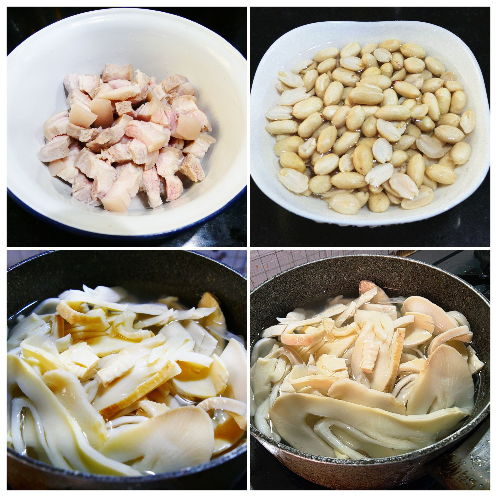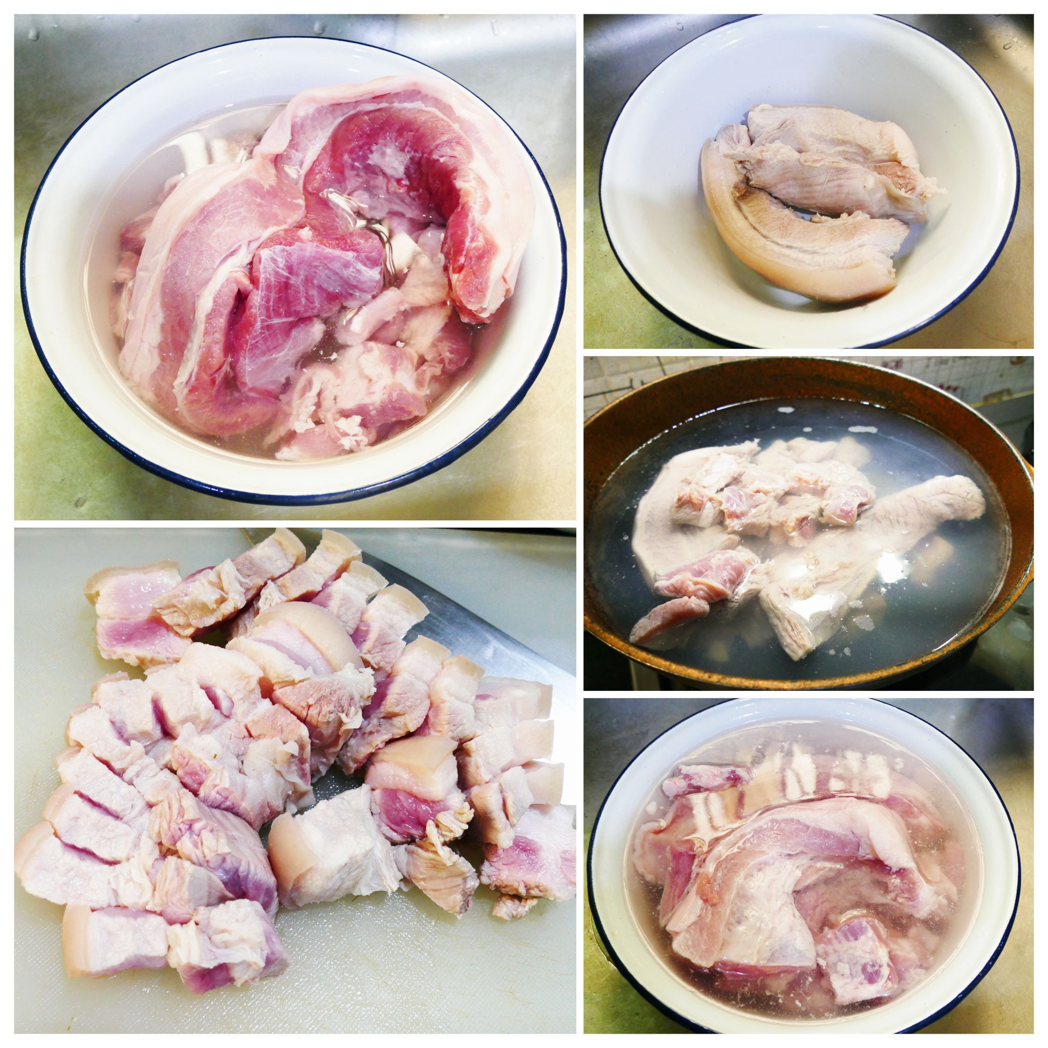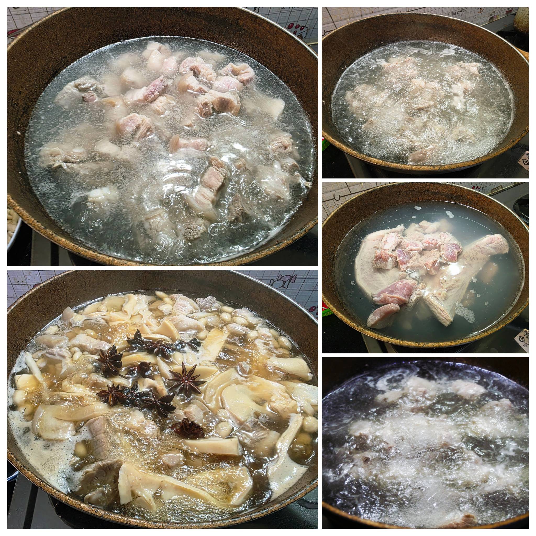 1. ตั้งกระทะหรือหม้อ ใช้น้ำซุปเดิม โดยเอาหมูสามชั้นใส่ลงไป คอยช้อนเอาฟองออก