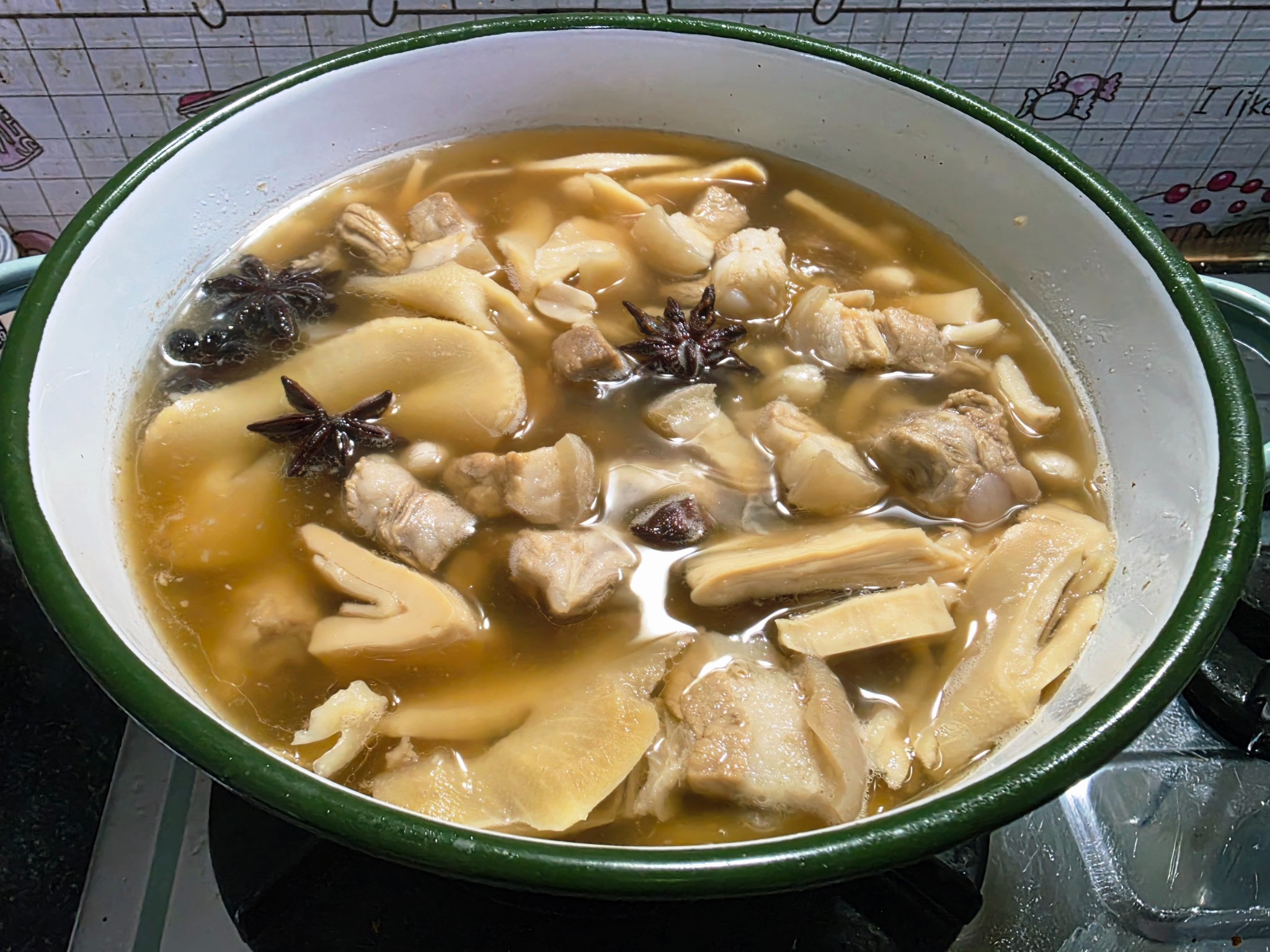 2. เอาหน่อไม้จีนกับถั่วคุดใส่ลงไป เติมน้ำให้ท่วมๆ ใช้ไฟกลางๆ ต้มไปเรื่อยๆ