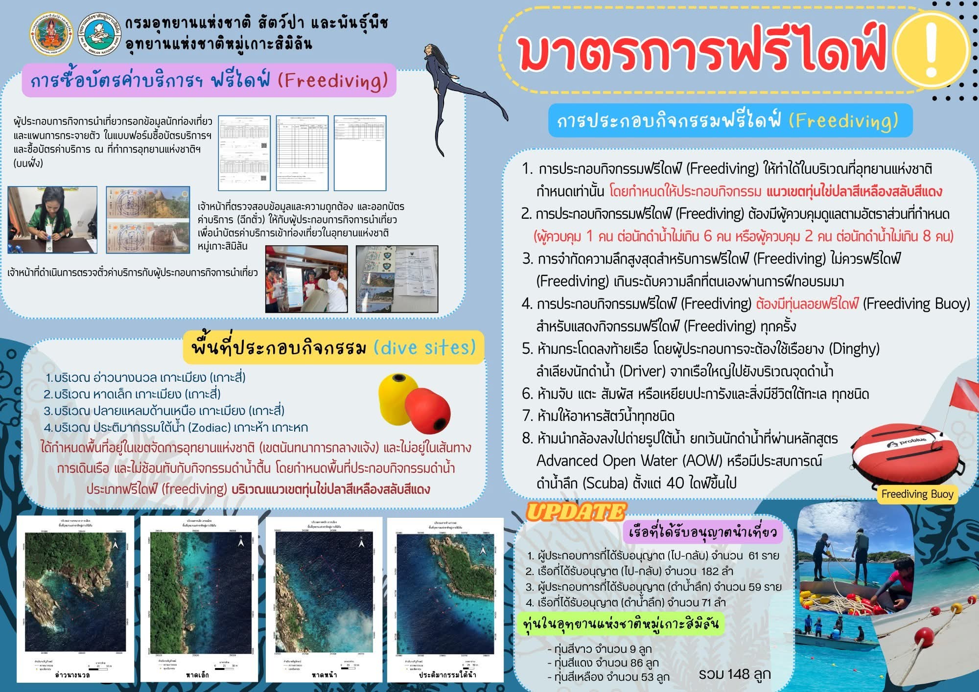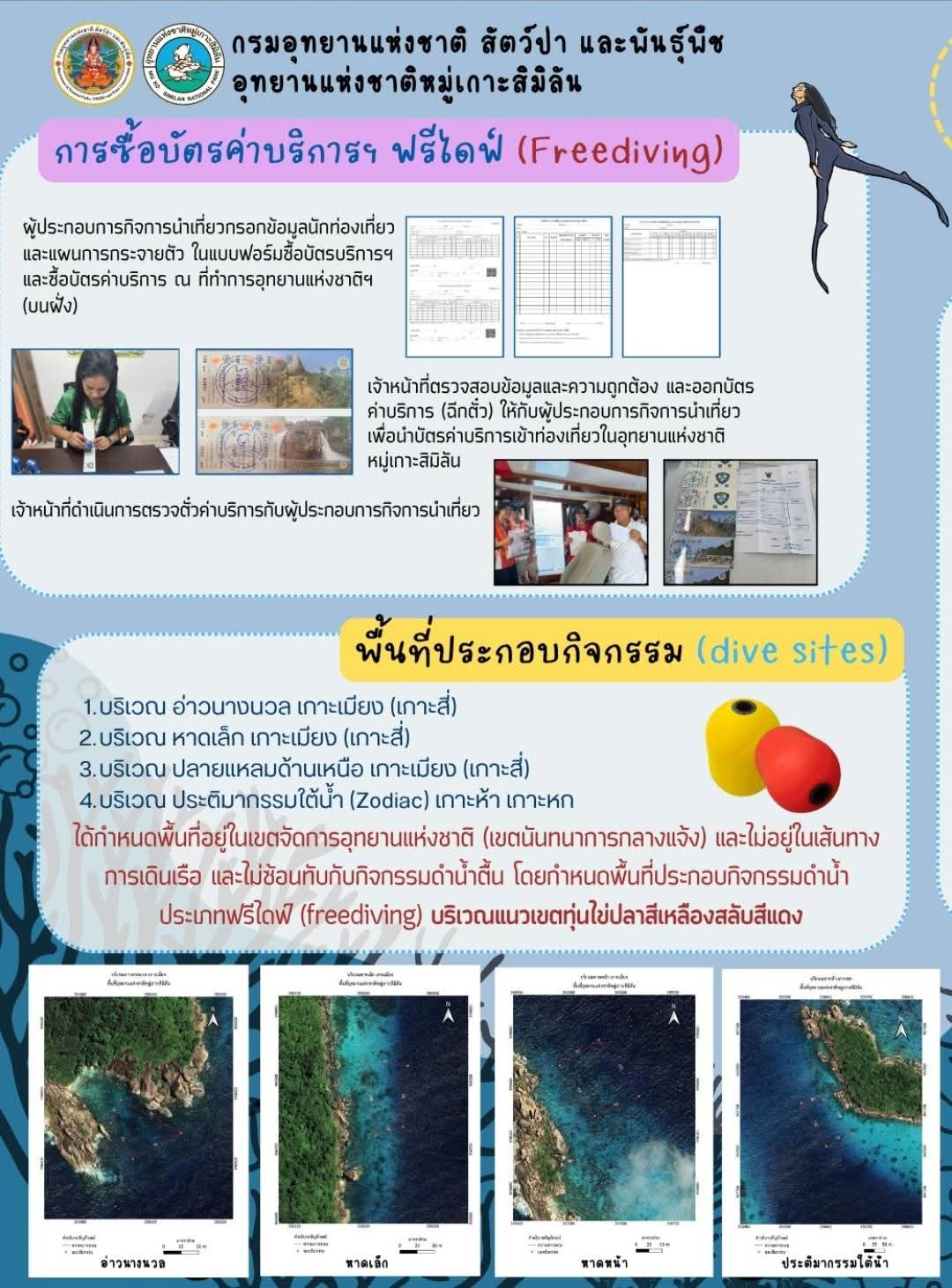 - ทางจนท.อช. แจ้งว่าให้ประสานงาน สอบถามรายละเอียดต่าง ๆ จากทางผู้ประกอบการได้เลย เพราะข้อมูลต่าง ๆ อาจมีการปรับเปลี่ยน และผู้ประกอบการ ต้องเตรียมข้อมูลของนักดำน้ำอิสระ Freediving ให้กับจนท.เพื่อขอซื้อตั๋วทำกิจกรรมดำน้ำอิสระ