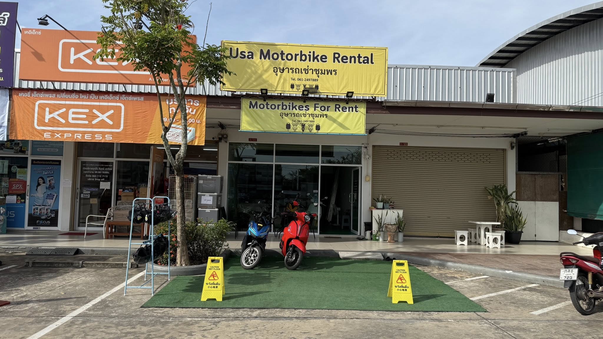 เราเดินตรงไปยังร้าน อุษา รถเช่าชุมพร ซึ่งอยู่ใกล้สถานีรถไฟมาก แค่ 350 เมตรเท่านั้น ก็ได้มอเตอร์ไซค์คู่ใจมาขับกัน เพื่อเริ่มทริป Low Price High Experience กันแล้วครับ นี่ถือเป็นครั้งแรกของพวกเราหลาย ๆ คนที่เดินทางไปสถานที่ท่องเที่ยวโดยขี่มอเตอร์ไซค์ไปเป็นขบวนเหมือน Road Trip เลยครับ