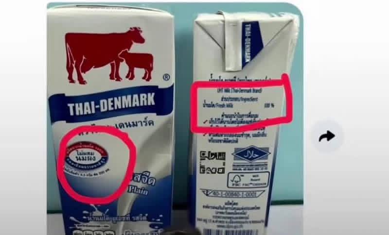 - ระบุว่า นมในไทยหลายยี่ห้อเป็น “น้ำนมโคสดแท้ 100%” ซึ่งมีระบุชัดเจนข้างกล่อง (เช่น นมไทย-เดนมาร์ค, นมจิตรลดา, นมหนองโพ) ส่วนนมที่ทำจากนมผงมาผสมน้ำเพื่อคืนรูป (เช่น นมพร่องไขมัน, นมปรุงแต่งรส) ก็มีจำหน่ายอย่างถูกต้องตามกฎหมาย และมีการระบุชัดเจนเช่นกัน