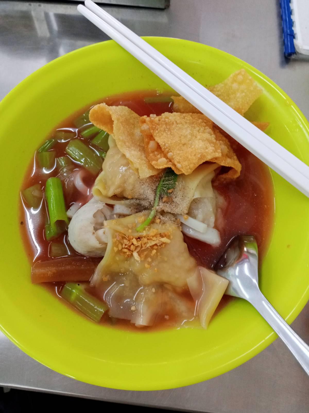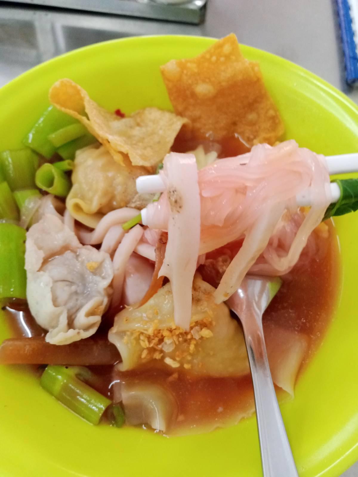 สั่งบะหมี่เกี๊ยวเย็นตาโฟพิเศษ ร้านนี้มีลูกชิ้นแคะด้วย นาน ๆ จะเจอที มีเส้นปลา เกี๊ยวทอดด้วยฮะ อีกชามสั่งเส้นใหญ่โฟธรรมดา เกี๊ยวหมูตัวโต หอมน้ำมันงา ได้มา 3 ตัว ลูกชิ้นเต้าหู้แคะแบบนี้อร่อยดี เลือ