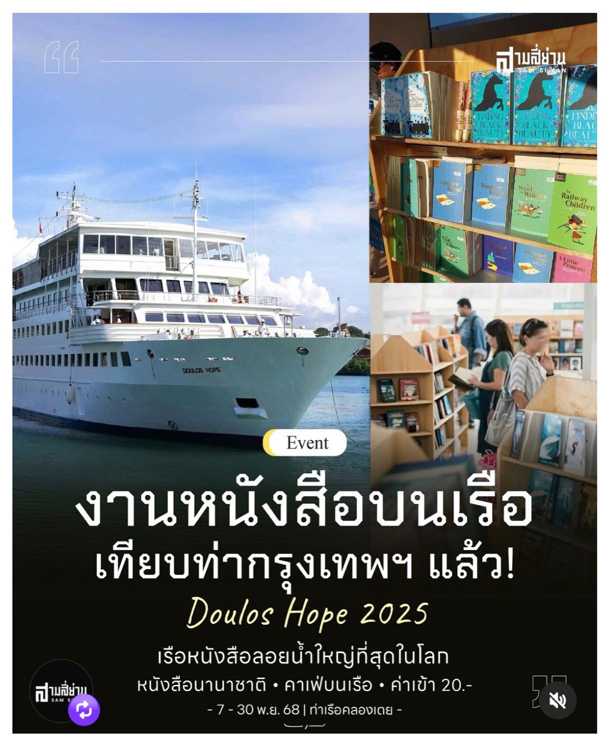 กรุงเทพฯ แล้วที่ท่าเรือคลองเตย ร้านหนังสือบนเรือที่รวมหนังสือนานาชาติกว่า 2,000 รายการจากทั่วโลก ทั้งวรรณกรรม หนังสือเด็ก หนังสือจิตวิตวิทยา ฝึกภาษา พัฒนาตัวเอง และอีกมากมาย ให้ได้เลือกช้อป พร้อมอาสาสมัครกว่า 35 ประเทศมาทักทายทุกคน ด้านในมีคาเฟ่บนเรือด้วยนะ งานนี้เทียบท่ายาวถึง 30 พ.ย. 68 นี้เลย แวะมาเดินเล่นกัน
