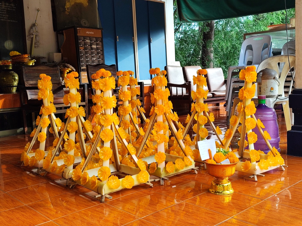นี่แหละ.. ผลงานของพ่อแสนคำบุญยอ คือสวยอะทุกคน ดอกผึ้งพิมพ์สวยเลย ไม่มีดอกแตกหรือหัก โครงสร้างก็ได้สัดส่วนสมดุลดี ดอกไม้ต่างๆ สดใสไม่มีเหี่ยวเฉา อย่างว่านะ เรามาทำบุญก็อยากถวายของสวยๆ งามๆ คิดเอาเองว่ายิ่งทำบุญด้วยของประณีตมากเท่าไรมันก็ยิ่งดี อันนี้ความเชื่อส่วนบุคคลนะ