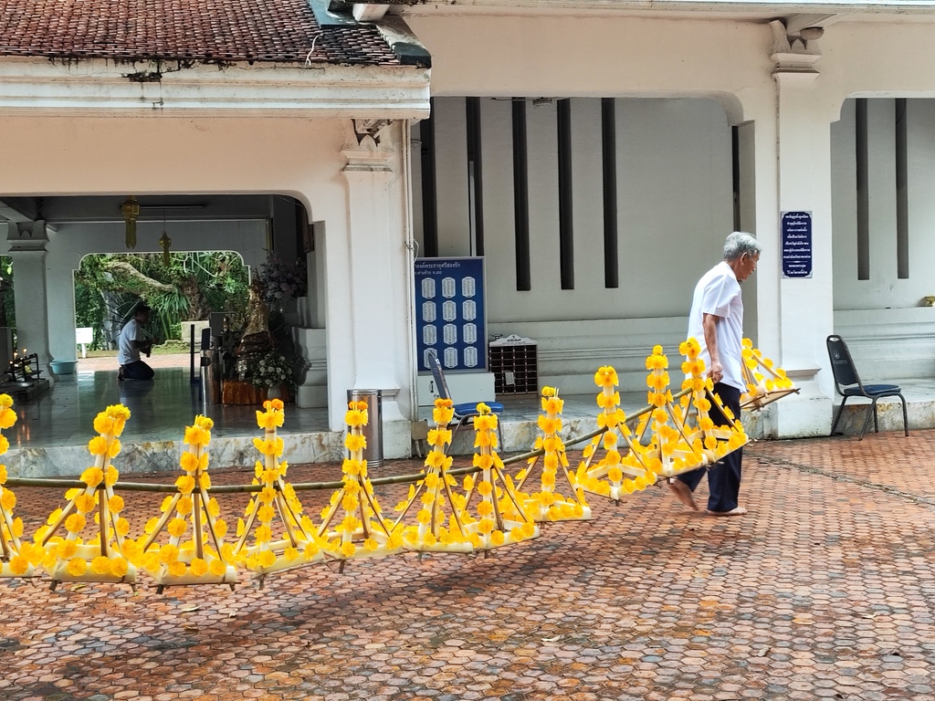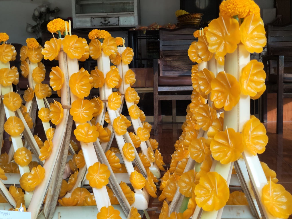 ต้นผึ้งของเราก็ไปเรียงรายที่ฐานขององค์พระธาตุศรีสองรักเรียบร้อย เหลืองอร่ามสวยงามมาก อิ่มอกอิ่มใจกันถ้วนหน้า ต้นผึ้งทั้งหมดจะถูกเก็บออกในตอนเย็นนะ จะมีการจัดการตามวิถีปฏิบัติแบบดั้งเดิม ไม่เกิดปัญหาขยะและไม่มีการนำต้นผึ้งมาวนซ้ำ ทุกต้นทำขึ้นใหม่เสมอ
