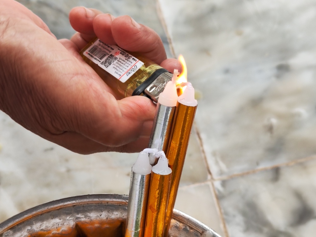 เริ่มจากจุดเทียนกันก่อน ไม่ว่าเทียนจะมีกี่เล่มก็จุดแค่ 2 เล่มเท่านั้นนะ (จำนวนเทียนในพานจะแปรผันตามจำนวนต้นผึ้งที่ถวาย) จากนั้นก็ยกพานและสวดตามพ่อแสน บทสวดไม่ยาวเท่าไร ตามด้วยอธิษฐานขอพร ใครมาขอพรใหม่..ต้องการสิ่งใดก็ขอไป ใครมาแก้บน..จะแก้เรื่องอะไรก็บอกท่านไป ปิดท้ายก็นำพานส่งต่อให้พ่อแสนเอาไปวางด้านใน เป็นอันเสร็จสิ้น รวดเร็วทันใจคนรุ่นใหม่มากๆ