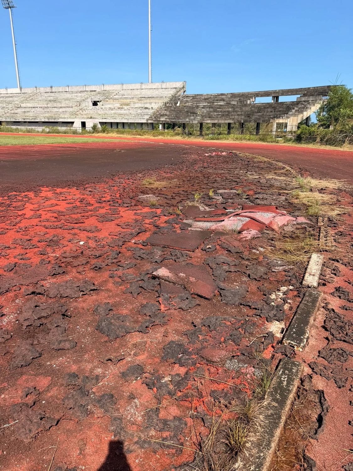 จริงๆ ลู่วิ่งแบบนี้ข้างใต้จะต้องเป็นระบบระบายน้ำเพื่อทำให้อายุการใช้งานเพิ่มขึ้น ทีมจังหวัดแจ้งว่าที่นี่ยังใช้ในการแข่งกีฬา สนามบอลใช้ได้ อัฒจันทร์ฝั่งนี้ใช้ได้ แต่ฝั่งนู่นยังไม่เสร็จ