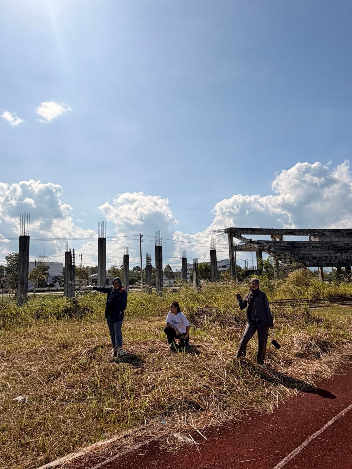 อัฒจันทร์ฝั่งนี้ เสร็จแล้ว แต่ถ้ามองไปอีกฝั่ง ยังจะเป็นปูนเปลือยอยู่ อีกอันยังโครงอยู่ ที่สนามกลางตรงนู่นฝนตกหนัก น้ำคงนองอยู่ ทำระบบระบายน้ำของสนามไม่ดี