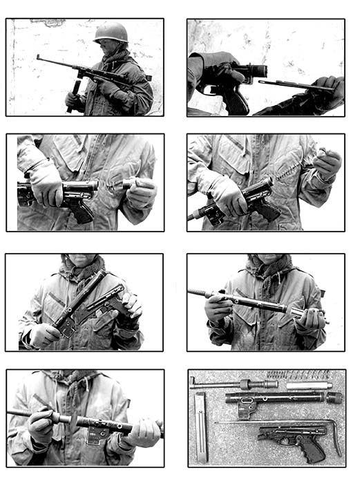 พานท้าย พานท้ายทำจากลวดเหล็กที่แข็งแรง สามารถยืดหดได้ (Telescoping stock) โดยสอดเข้าไปในโครงปืน ทำให้ปืนสั้นลงมากเมื่อพกพา