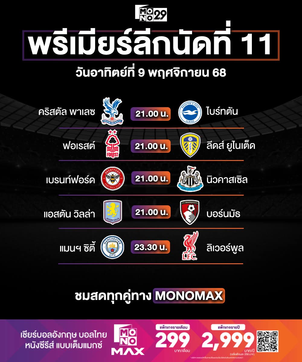 🔎 โปรแกรมการแข่งขัน พรีเมียร์ ลีก 2025/26 แมตช์ที่ 11 ⚽🏴 วันอาทิตย์ ที่ 9 พฤศจิกายน 2568 🔴
