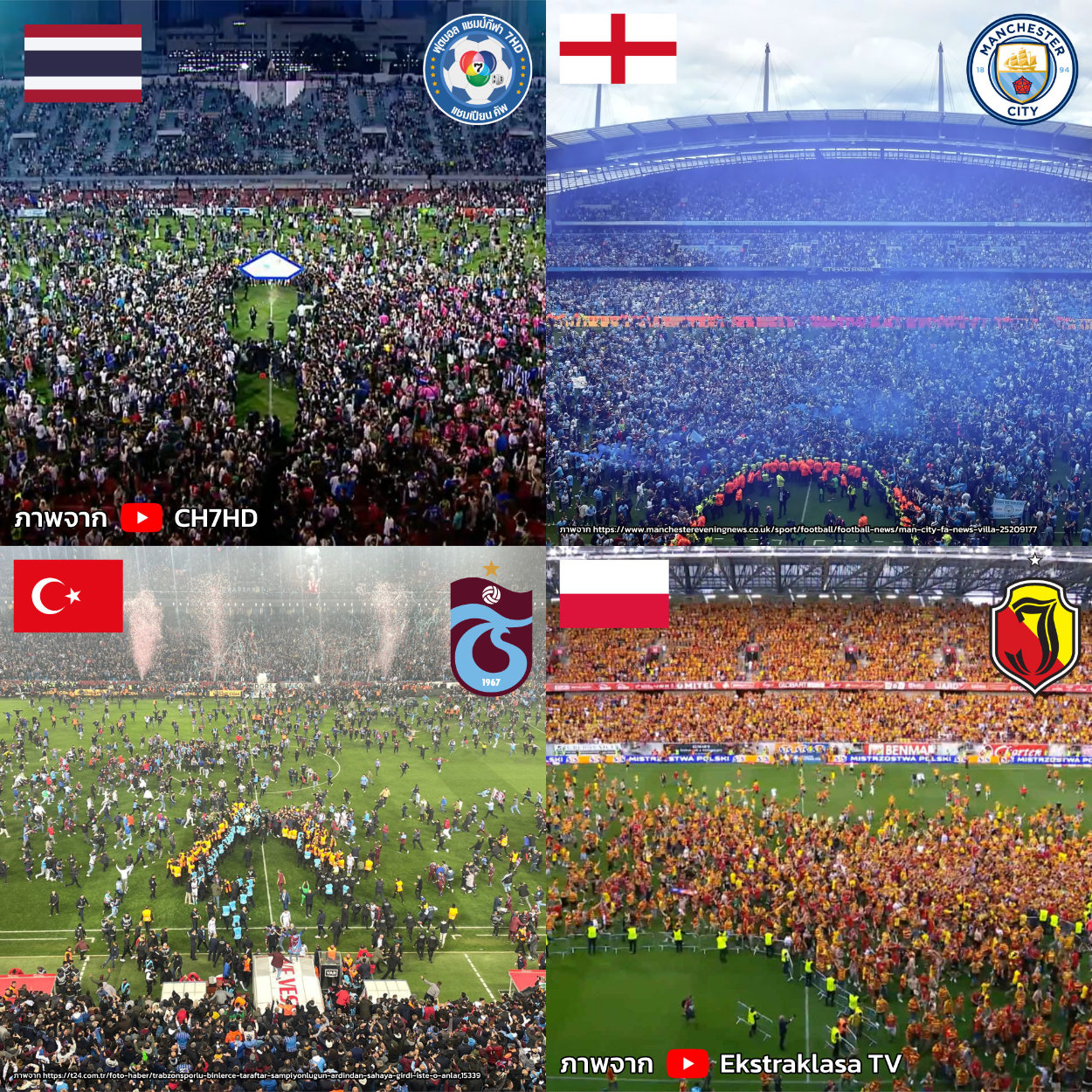 - เหตุการณ์ที่ 4 : โปแลนด์ ยาเกียลโลเนีย เบียลีสต็อก (Jagiellonia Białystok) กับแชมป์ลีกโปแลนด์ครั้งแรกในประวัติศาสตร์ของสโมสร โดยแฟนบอลลงมาฉลองแชมป์อย่างมัน โดยมีเจ้าหน้าที่สนามถือรั้วกันไว้ เพื่อที่จะทำพิธีรับถ้วย โดยแฟนบอลลงมาเฮในสนามจนถึงพิธีรับถ้วยเลย