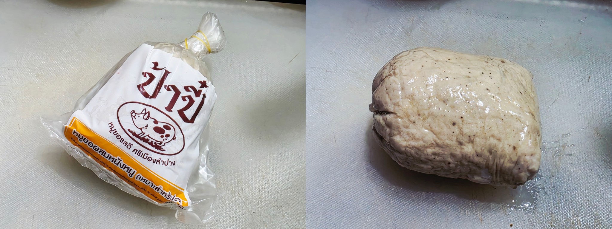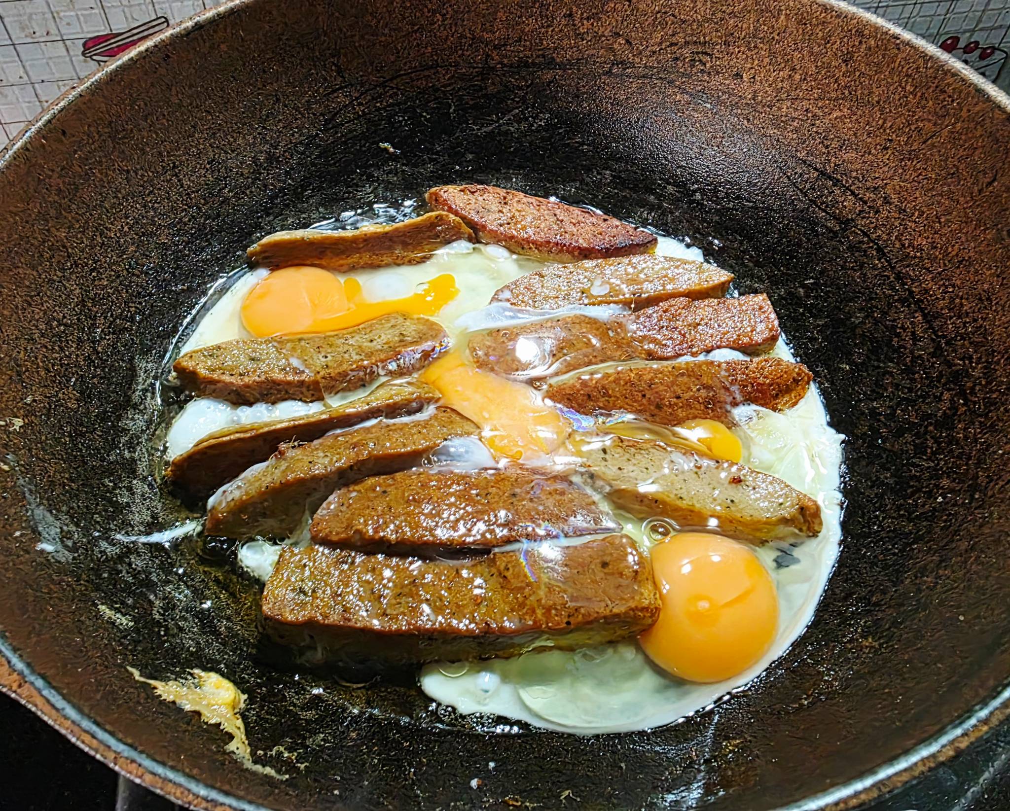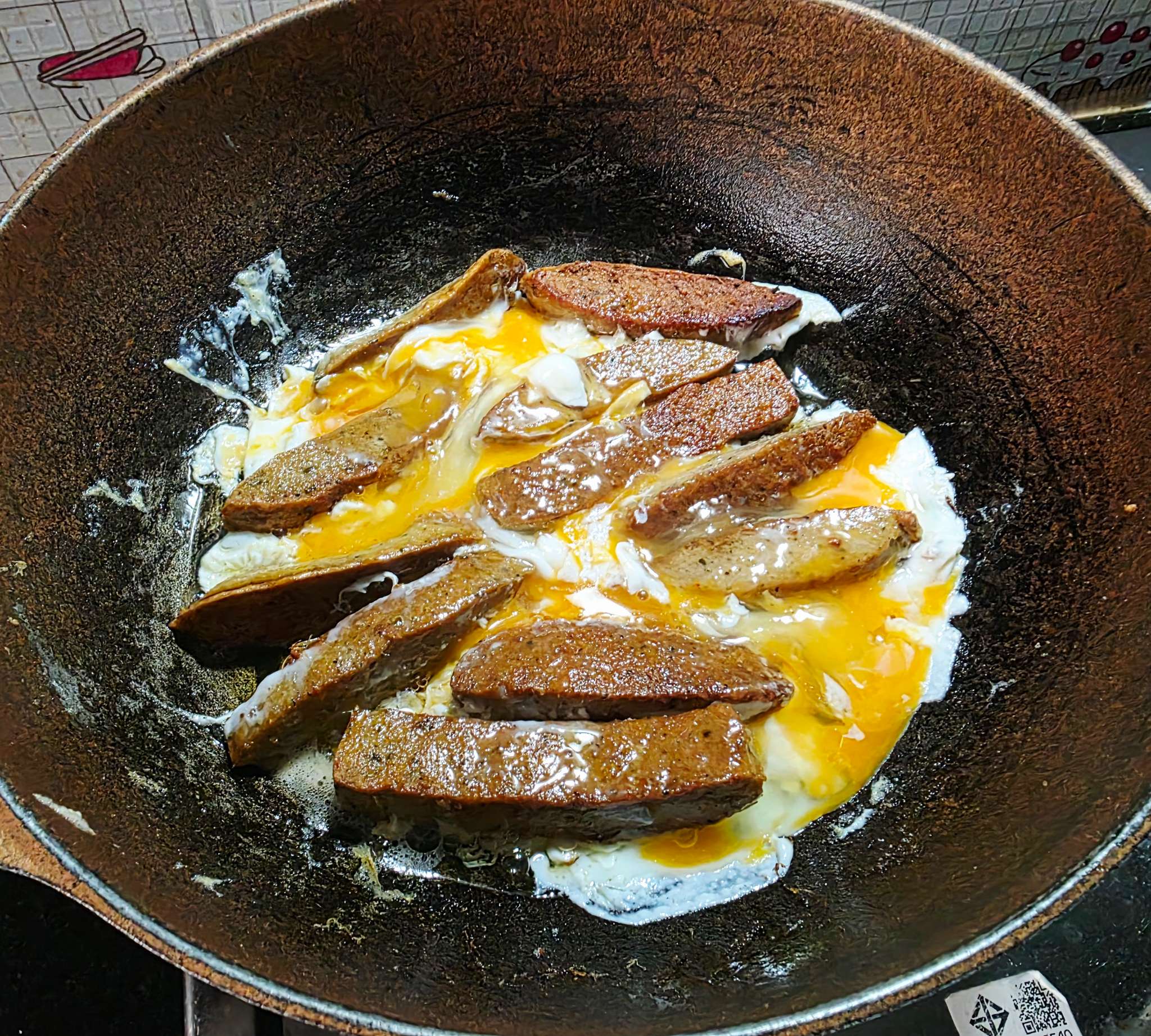 ผมเอาหมูยอก้อน มาหั่นตามยาว ทอดน้ำมัน จากนั้น ตอกไข่ไก่ ใส่ลงไป 2-3 ฟอง ค่อยๆ ยี ๆๆ ให้ค่อยๆ สุก ให้ไข่ขาวสุกก็ใช่ได้
