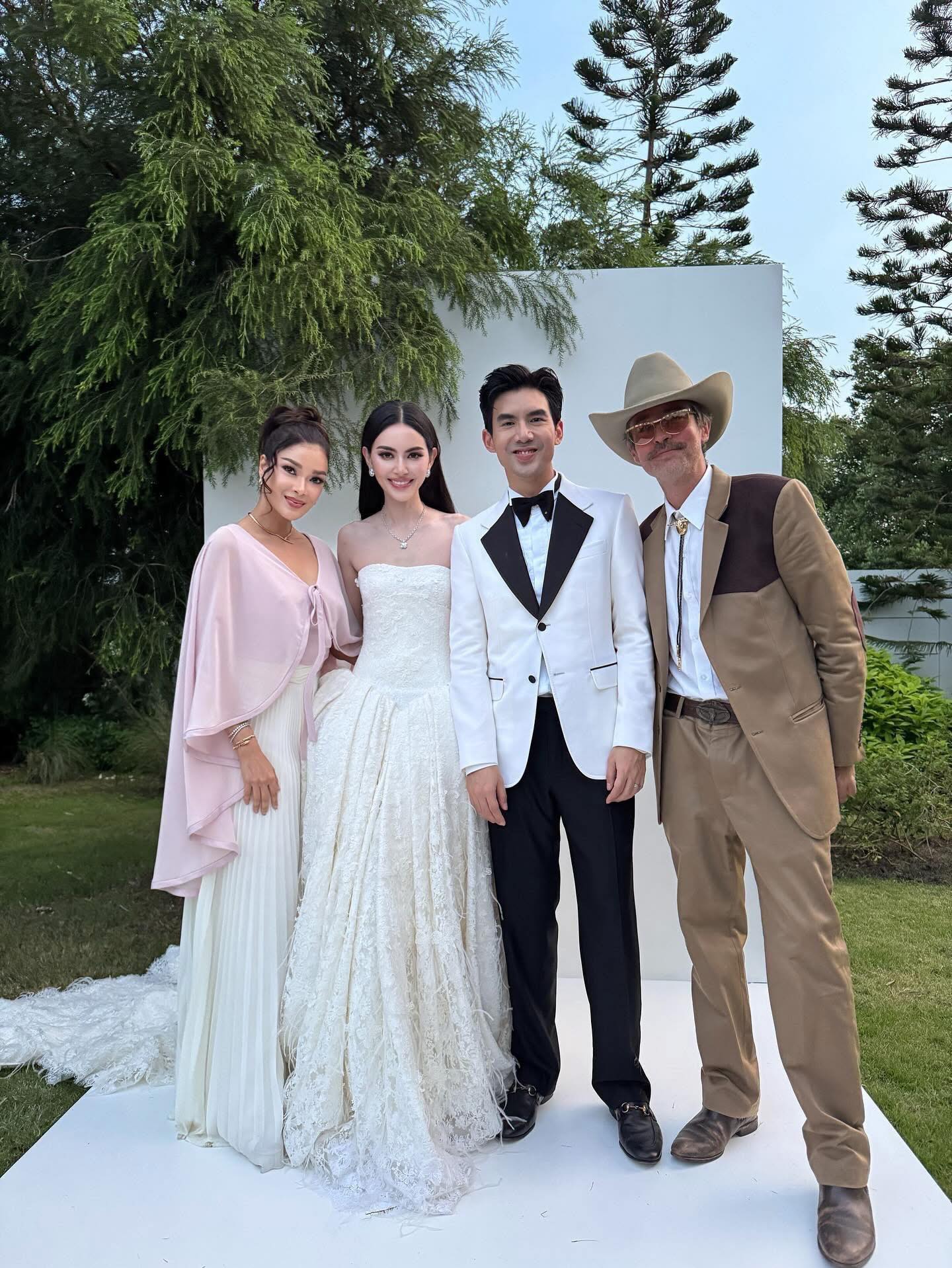 ใหม่ ดาวิกา ที่ปรากฏตัวในชุดเจ้าสาวเกาะอกสีขาวสุดหรูหราโดดเด่นด้วยดีไซน์ที่เน้นความอ่อนช้อยของลูกไม้และผ้าพลิ้วไหว ทำให้เจ้าสาวดูสง่างามดุจนางฟ้า ส่วนเจ้าบ่าว