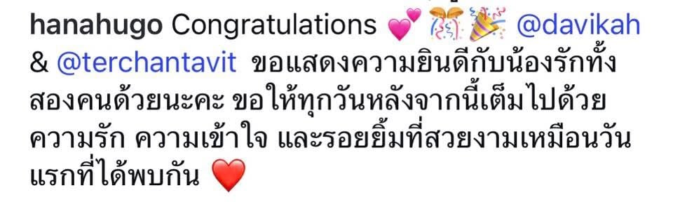 “Congratulations @davikah & @terchantavit ขอแสดงความยินดีกับน้องรักทั้งสองคนด้วยนะคะ ขอให้ทุกวันหลังจากนี้เต็มไปด้วย ความรัก ความเข้าใจ และรอยยิ้มที่สวยงามเหมือนวันแรกที่ได้พบกัน”