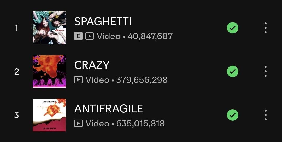 โดยทั้งสามเพลงได้ปล่อยกันละปี SPAGHETTI 2025, CRAZY 2024 และ ANTIFRAGILE ที่ปล่อยมาแล้ว 3 ปีตั้งแต่ 2022 ได้กลับมาฮิตอีกครั้งมียอดผู้ฟังเพิ่มขึ้นอย่างต่อเนื่อง