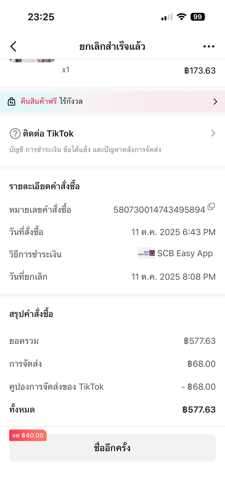 เมื่อวันที่ 11 ต.ค. 68 เราได้ทำการซื้อสินค้าใน tiktok ทั้งหมด 3 ร้าน และโอนเงินไปโดยใช้แอป SCB เวลา 18.43 น. แล้วเรามาเช็ตใน tiktok อีกทีตอนประมาณ สองทุ่มวันเดียวกัน ปรากฏว่าเงินที่โอนไปไม่ตัดระบบให้ร้านค้า ขึ้นว่ายังไม่ได้ชำระ ทั้งๆที่ตัดยอดเงินในธนาคารแล้ว เราเลยตัดสินใจยกเลิกออเดอร์ เพราะคิดว่าเงินน่าจะคืนเข้าบัญชีเลย แล้วค่อยกดสั่งซื้อใหม่