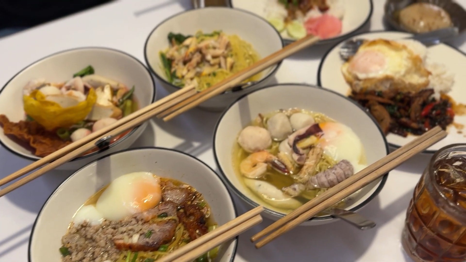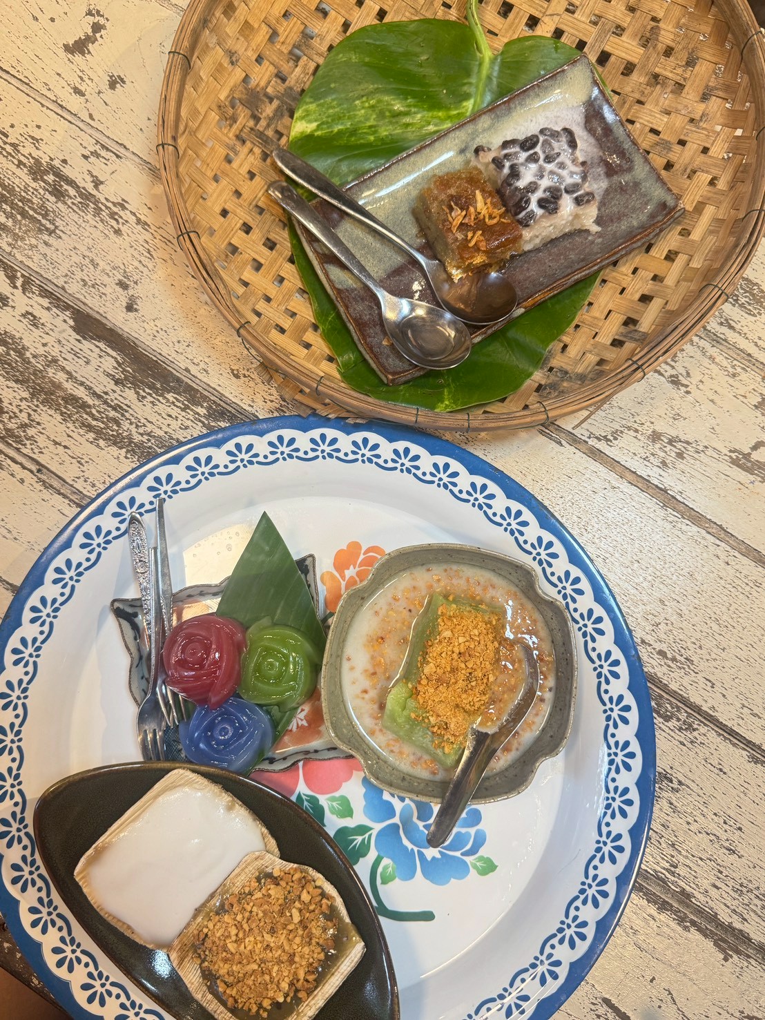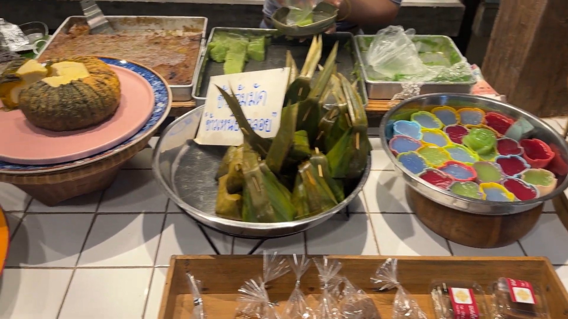หลังจากกินของคาวแล้วก็ต้องปิดท้ายด้วยของหวานกันใช่ไหมครับ พวกผมก็เลยไปกันต่อที่ร้านขนมไทยป้าหนอม บรรยากาศร้านดีเป็นฟิวเหมือนบ้านต้นไม้ แต่ตัวร้านแอบหายากนิดนึง อาจจะต้องถามคนพื้นที่แถวๆนั้นและทางร้านใช้วัตถุดิบจากสีของธรรมชาติมาทำขนม ขนมชั้นสีทับทิมใช้สีจากครั่งกับใบปลากริม ที่ห้ามพลาดเลยคือขนมบันดุ๊ก ที่กินได้ที่จังหวัดตราด คล้ายขนมชั้น ในทุกเมนูจะมีถั่วทำให้กินรวมกันมีรสชาติหวานเค็ม อยากจะว่าพวกผมสั่งเกือบทุกเมนูแต่บิลออกมา 100 บาทกว่าๆ ซึ่งมันถูกมากๆและ ตัวขนมไม่ได้มาชิ้นเล็กๆด้วย โดยรวมคือได้ทั้งบรรยากาศชิวๆ กินขนมหวานราคาสบายกระเป๋า