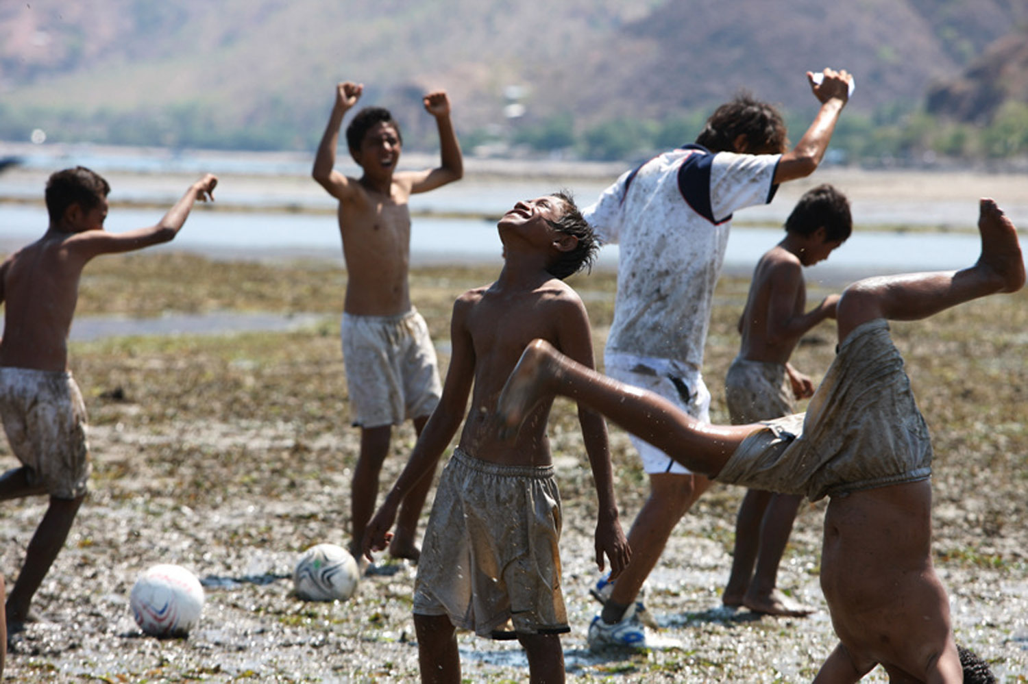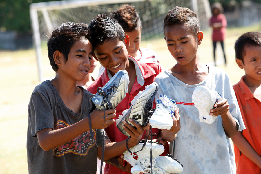 และไม่ว่าไปทางเขาก็เห็นแต่เด็กๆ เล่นฟุตบอลกันทั้งนั้น แต่แทบทุกคนไม่มีอุปกรณ์กีฬากันเลย