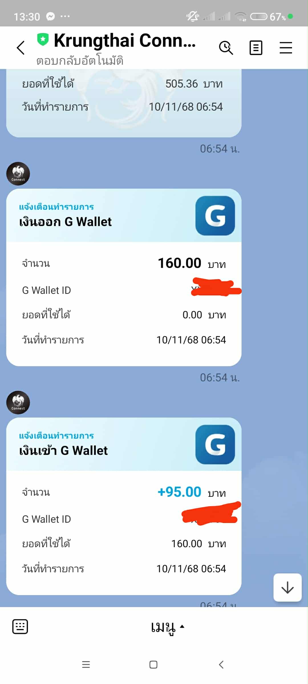 -มียอดแจ้งเงินเข้า จากประเภทหัก G-Wallet ID +95 บาท