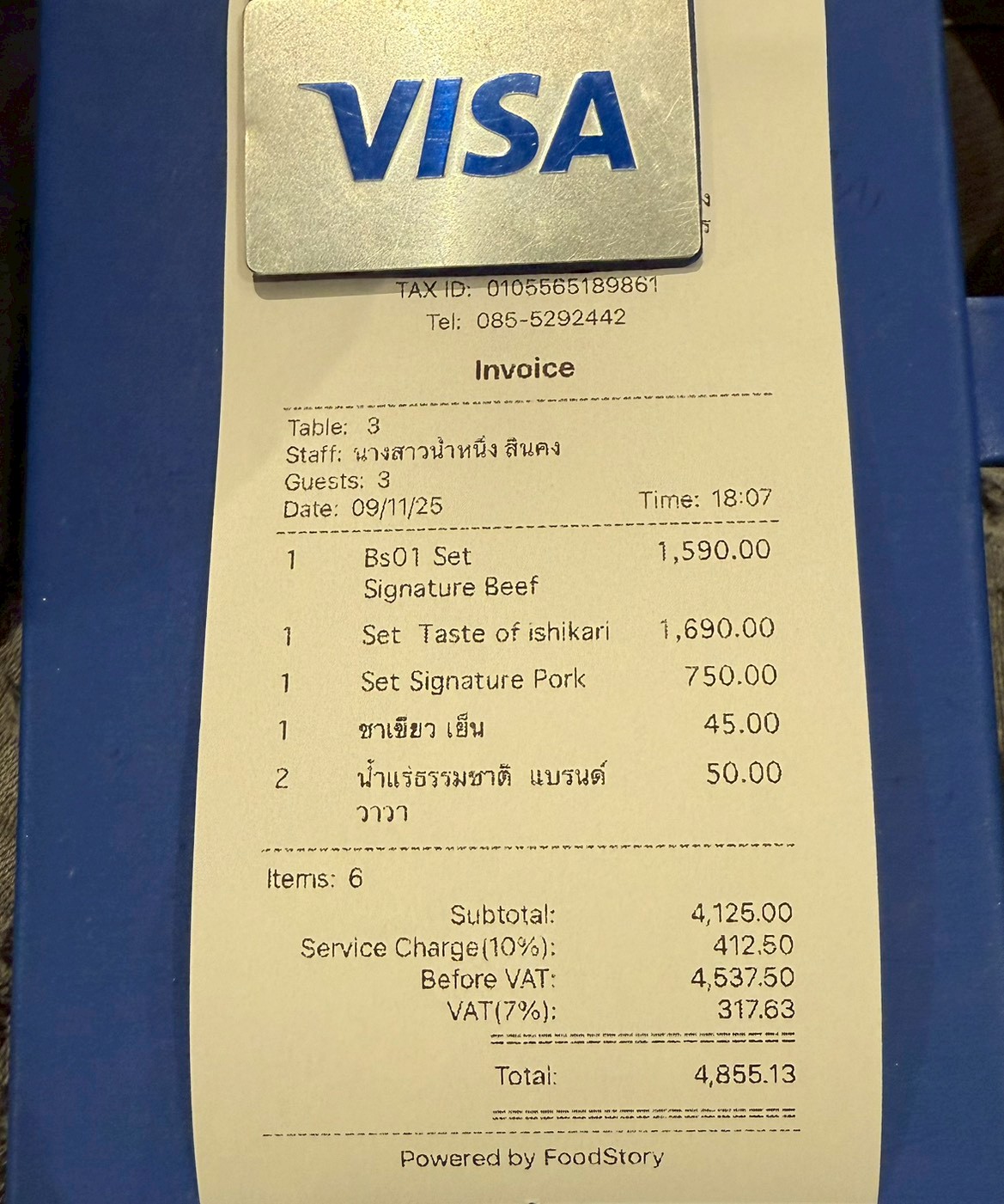 ราคาอาหาร ต้องยอมรับว่า ค่อนข้างสูง เซ็ทเนื้อ เน็ตแล้ว ตกเกือบ 2 พัน ส่วนเซ็ทหมู ราวๆ 900 ถือว่าแพง (แพงกว่าร้านหมูย่าง ดีเจเพชรจ้าที่ สยาม ร้านนึงที่ผมชอบ อีก)