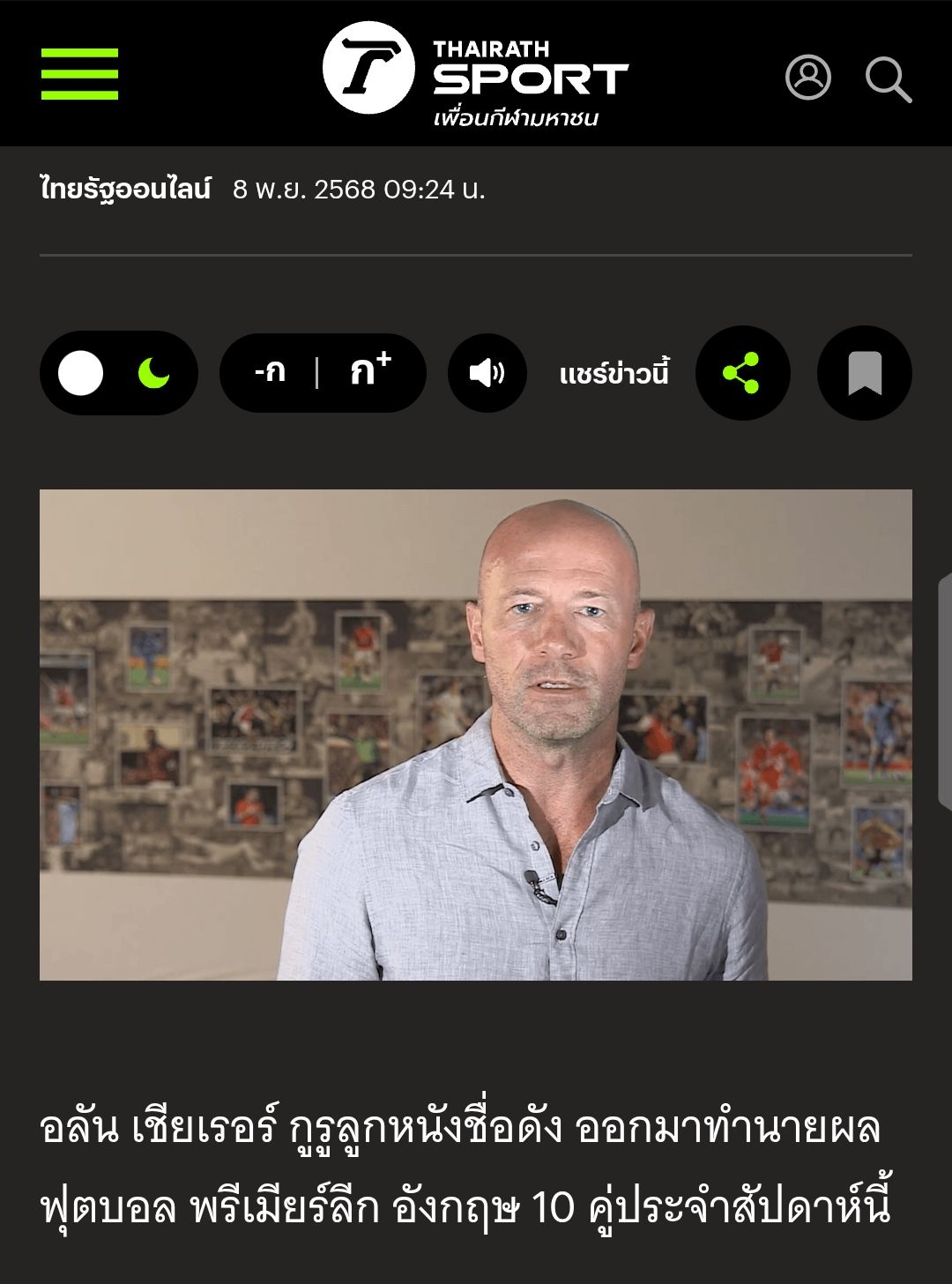 อลัน เชียเรอร์ อดีตกองหน้าชื่อดัง ที่ผันตัวมาเป็นนักวิเคราะห์ฟุตบอล ออกมาทำนายผลการแข่งขันฟุตบอล พรีเมียร์ลีก อังกฤษ ฤดูกาล 2025-26 ประจำสัแดาห์นี้ โดยมองว่าจะมีทีมยักษ์ใหญ่พ่ายแพ้ทีมเดียว นั่นก็คือ &