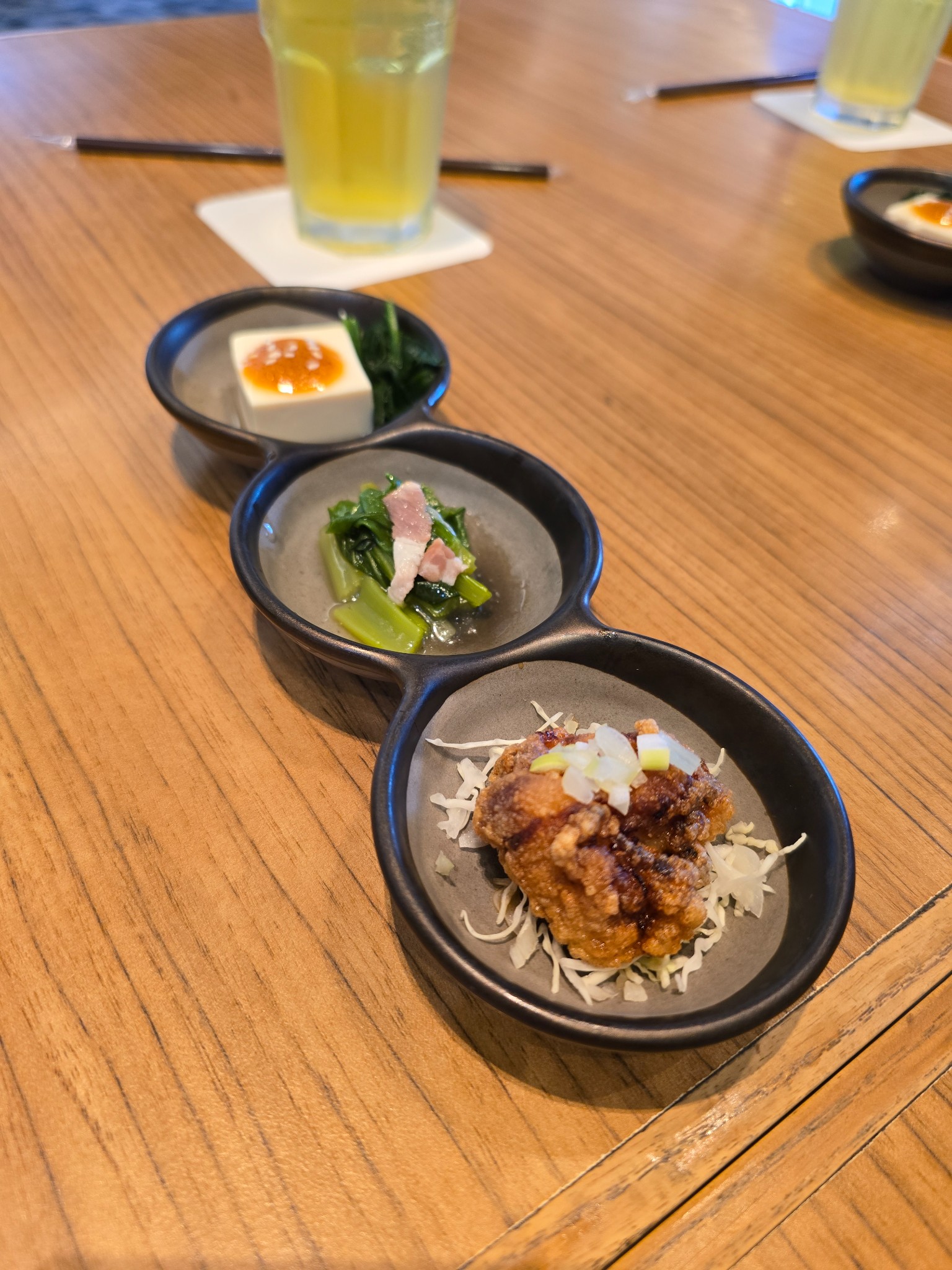 ก่อนที่จานหลักจะมา ทางร้านจะเสิร์ฟ โคบาจิ (Kobachi) หรืออาหารเรียกน้ำย่อยจานเล็ก ๆ 3 อย่างให้ฟรีทุกคนครับ