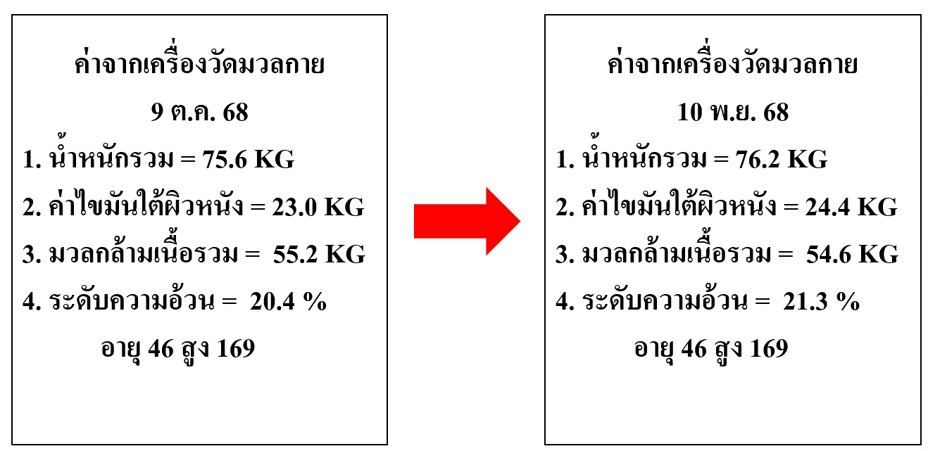 ผมเคยหนักถึง 98 กิโล มาเดือนกุมภาผมเริ่มลดไขมันสะสมผ่านมาหกเดือน นน.เหลือประมาณ 73 ก็เริ่มน้ำหนักนิ่งเลยหาข้อมูลต่าง ๆ เริ่มทานตามค่า TDEE ประมาณ 2100 แคล เริ่มออกกำลังแบบเวทที่บ้านเน้นท่า-ไหล่-อก-หลัง วันต่อมา-ขา-ก้น วันต่อมาคาดิโอโดยการเดินโซน 2 จากที่ทำงานกลับบ้านระยะ 5 กิโล วันต่อมาหยุด สลับกันแบบนี้จนถึงเดือนพฤศจิกายน.... เริ่มเห็นความเปลี่ยนแปลงพุงเริ่มยุบแต่น้ำหนักขึ้น ๆ ลง ๆ ระหว่าง 74 - 76 แต่พอไปชั่งเครื่องวัดมวลการที่ฟิตเนสระหว่างเดือน ตุลาคม - พฤศจิกายนวันนี้ล่าสุด ค่าต่าง ๆ เริ่มแย่ลงตามรูป อยากถามว่าผมต้องเริ่ม Calory Dacifict ไหมครับ เดิมทีทานตาม tdee วันละ 2100 cal โดยแบ่งสัดส่วนเป็น คาร์บ 45 โปรตีน 30 ไขมันดี 25 ต้องตัดเหลือวันละ 1800 CAL ไหมครับ หรือว่าต้องทำยังไงช่วยแนะนำผมด้วยครับขอบคุณมาก ๆ ครับ