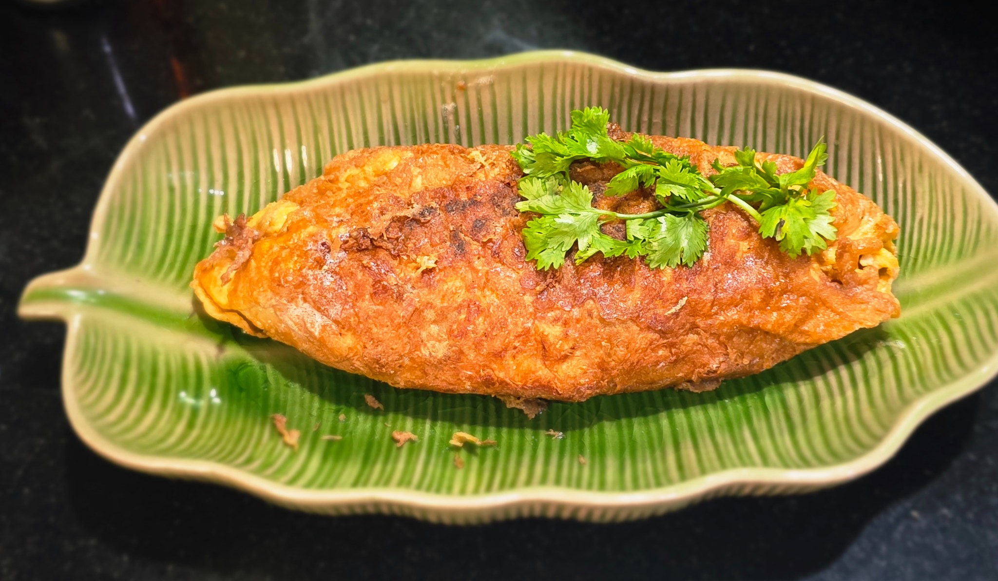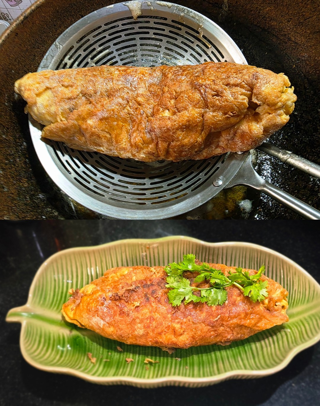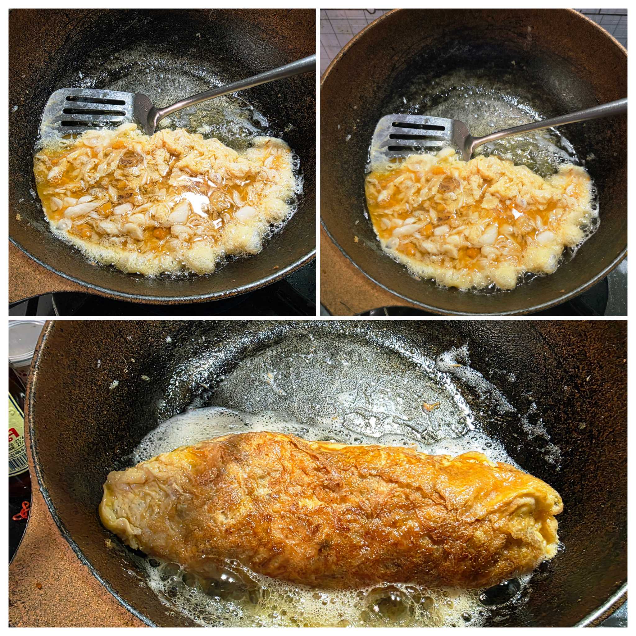 ผมแบ่งน้ำไข่ไว้สำหรับ เติมในไข่เวลาม้วนตัวช่วงหลังๆ หรือปิดช่องว่างหรือรูโหว่ของก้อนไข่เจียว ก่อนเสร็จเน้นใช้ไฟแรง ทำให้ไข่เจียว ไม่อมน้ำมัน