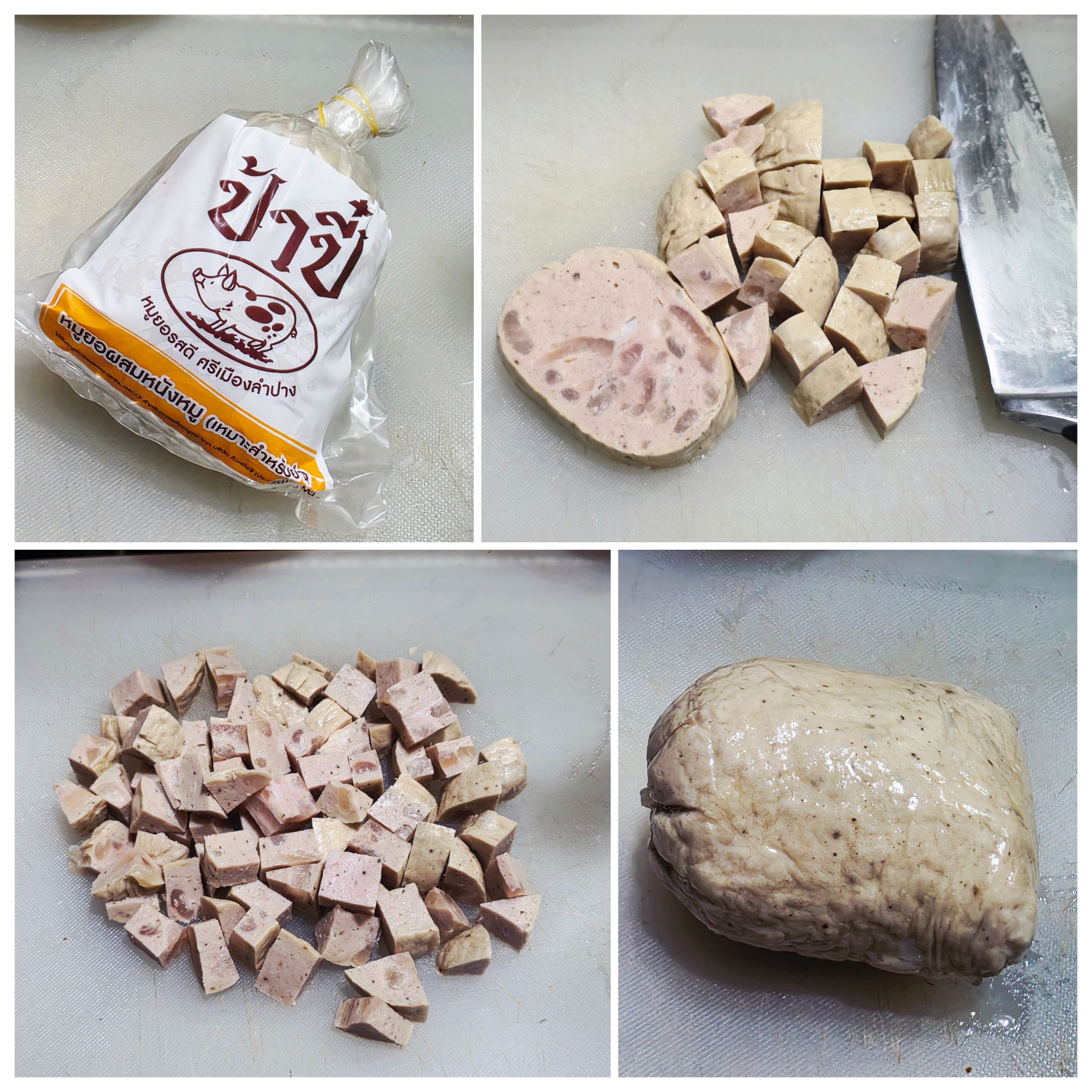 2. เอาหมูยอหั่นเต๋าใส่ลงไป ผัดให้หอมๆ ตอกไข่ใส่ลงไป ยีเขาๆ ให้ไข่ขาวสุกหน่อยๆ