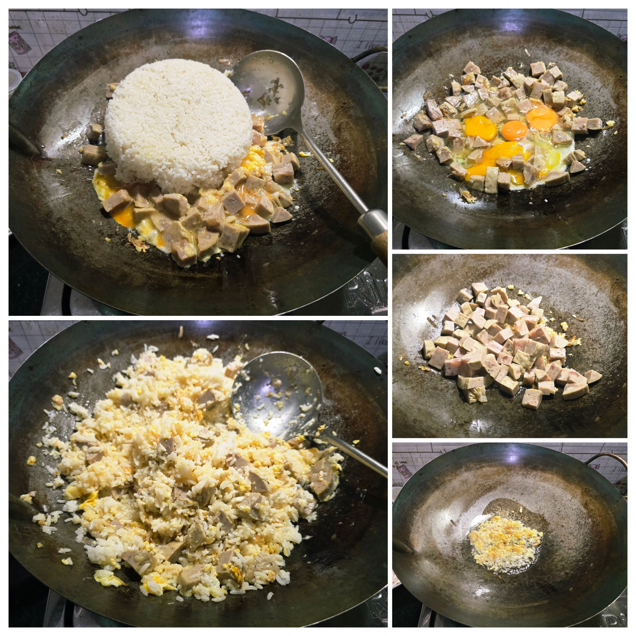 ผมใช่เนื้อปูก้อนแบบแตก (ถูกหน่อย ฮ่าๆๆ) เนื้อก้ามอ่อนปู(ไม่มีแกนกลาง) เนื้อปูตัว และก็ไข่ปู ผมใช้ไข่ไก่ 4 ฟอง , ข้าวเย็น 1 กระมังย่อมๆ (ข้าวเย็นนี้ ผมใช้เป็นข้าวหอมมะลิ ที่กินปกติ ความร่วนของเม็ดจะน้อยกว่าข้าวขาวทั่วไป ผมจะเอาน้ำมันเจียวหอมใส่ลงไปคลุกให้เข้ากัน เวลาผัดจะช่วยให้เมล้ดข้าวแยกตัวได้ดี) และก็ หมูยอ 1 ถุง เป็นหมูยอหนัง ยี่ห้อป้าปี๋ ลำปาง หั่นเป็นเต๋า