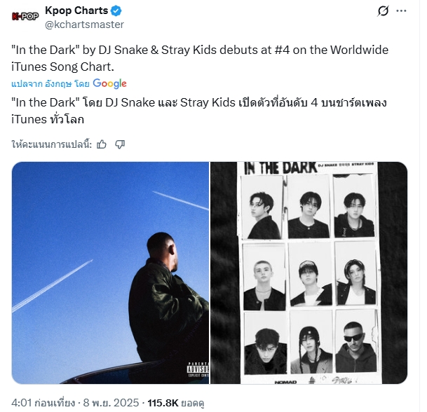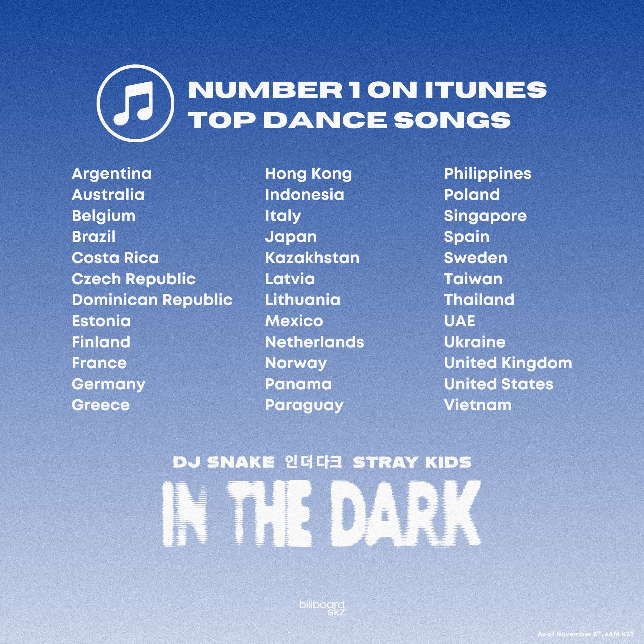 🔥 "IN THE DARK" เพลงนี้ผสมผสานเสน่ห์ของ Stray Kids เข้ากันกับซาวด์อิเล็กทรอนิกส์ที่เป็นเอกลักษณ์ของ DJ Snake ทำให้เกิดเป็นเพลงที่มีแนวดนตรีน่าสนใจ ได้เปิดตัวที่อันดับ 4 บนชาร์ตเพลง iTunes ทั่วโลก