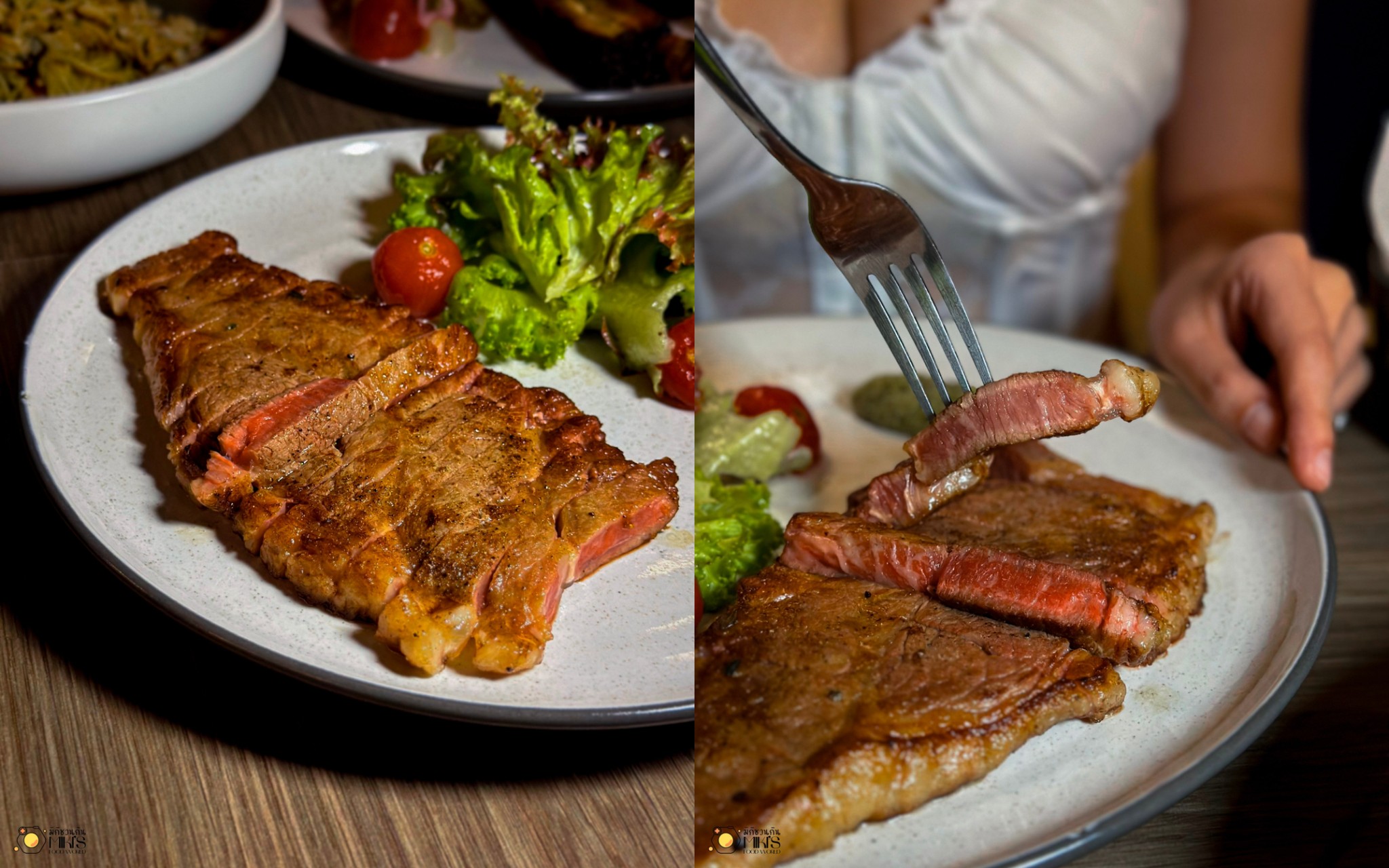 Japanese Wagyu Striploin A4 (250G) (1790) วากิว A4 จากญี่ปุ่น ที่ย่างมาแบบ medium rare เนื้อนุ่มละลายในปาก มีความหวานและมันกำลังดี เสิร์ฟพร้อมวาซาบิดองและมะเขือเทศบีจิน เหมาะมากกับไวน์ตัวแรงจากฝรั่งเศส
