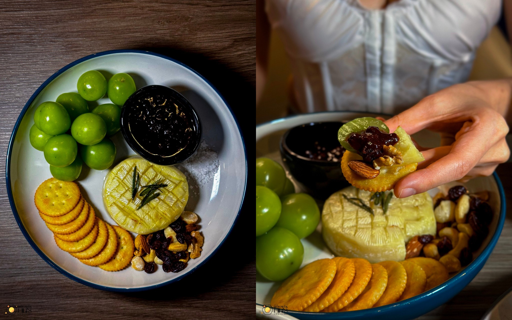 Signature Baked Brie (490) ชีสบรีเนื้อนุ่ม หอมกลิ่นน้ำผึ้งและน้ำมันมะกอก เสิร์ฟพร้อมองุ่น ถั่ว และแครกเกอร์ ทั้งเค็ม มัน หวาน ครบในคำเดียว