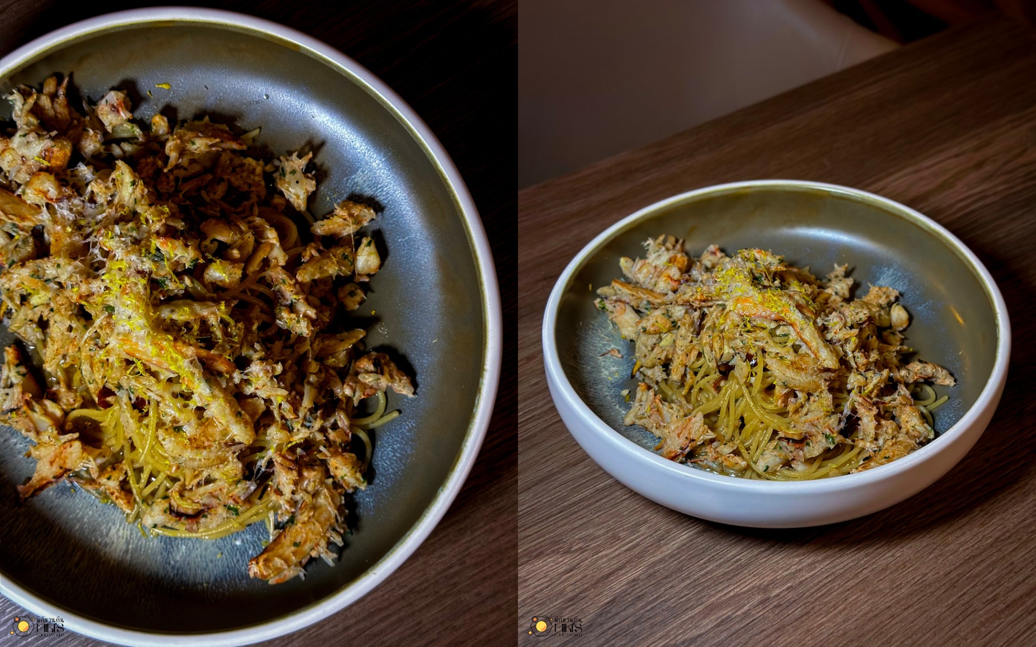 Super Crab Aglio e Olio Pasta (590) สปาเกตตี้ผัดแห้งสไตล์อิตาเลียน ใช้เนื้อปูม้าแน่นๆ คลุกกับมิโสะ กระเทียม และพาเมซานชีส จานนี้ทั้งหอม ทั้งเค็มมันพอดี เหมาะกับไวน์ขาวกรุบๆ หรือสปาร์กลิงไวน์ก็สดชื่น