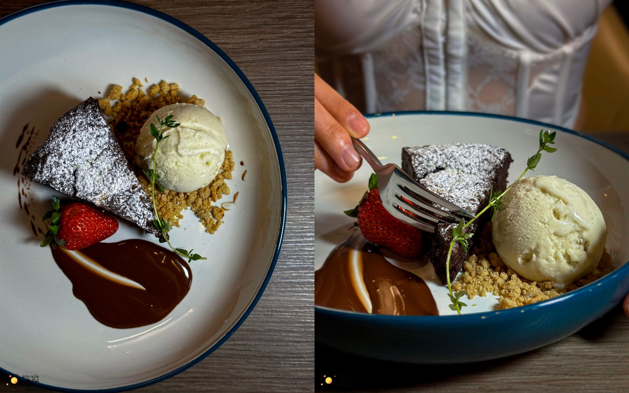 Warm Flourless Chocolate Cake & Vanilla Ice Cream (290) เค้กดาร์กช็อกเข้มข้น 70% เนื้อหนึบละลายในปาก เสิร์ฟคู่ไอติมวานิลลามาดากัสการ์ จานนี้คือการปิดท้ายมื้อที่เพอร์เฟกต์ เข้ม หอม ละมุน และลงตัว