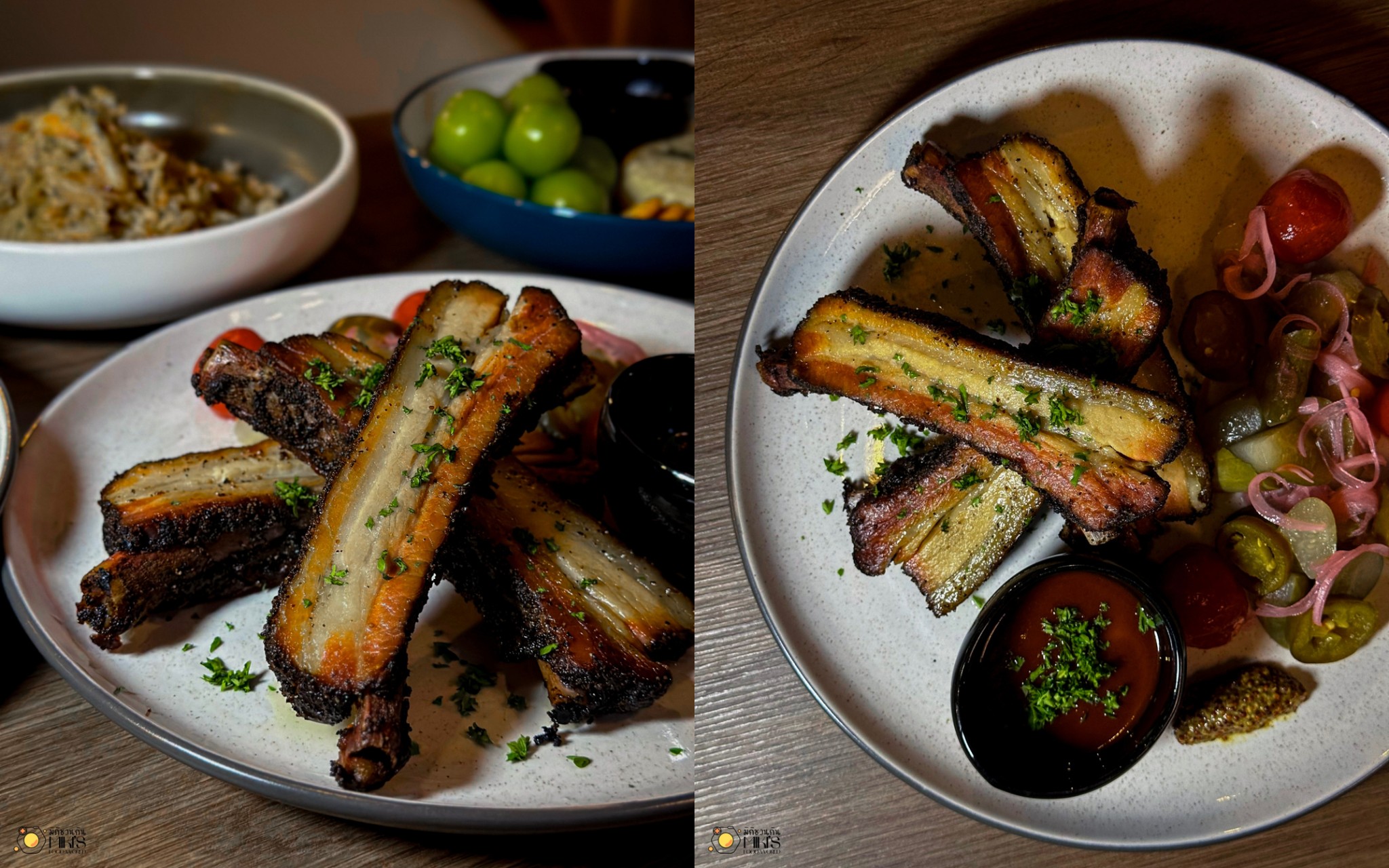 Texas Style Smoked Pork Ribs (690) ซี่โครงหมูรมควัน เนื้อนุ่มร่อน ดิปซอสบาร์บีคิวหวานๆ ที่มีกลิ่นหอมของวิสกี้ไทย ทานคู่กับไวน์คือความเข้มที่ลงตัวที่สุดในค่ำคืนนี้